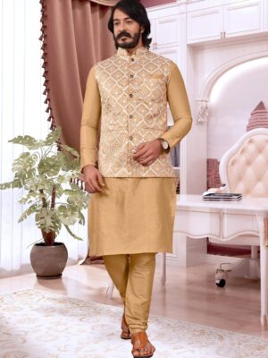 Beige Gold Silk Designer Embroidered Waist Coat Jacket for Men for wedding