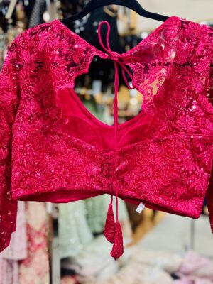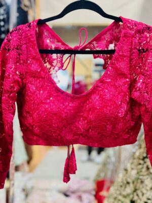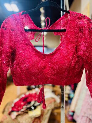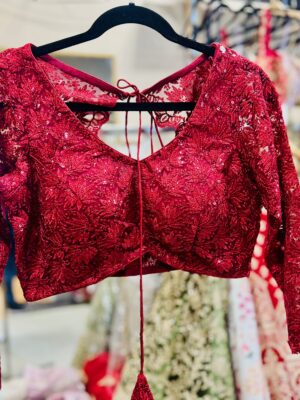 Stylish crimson net blouse with threadwork & sequins