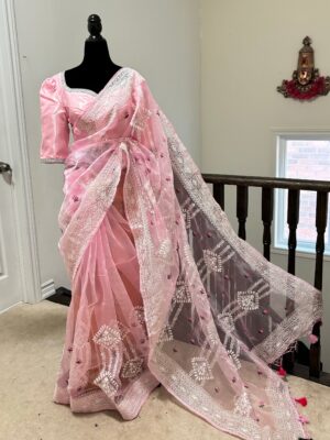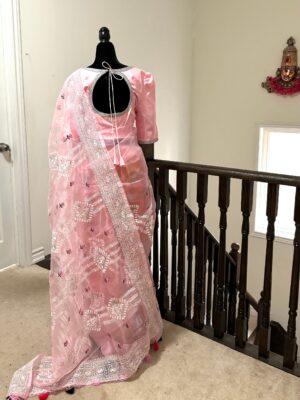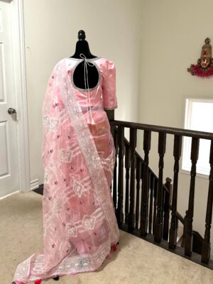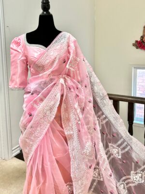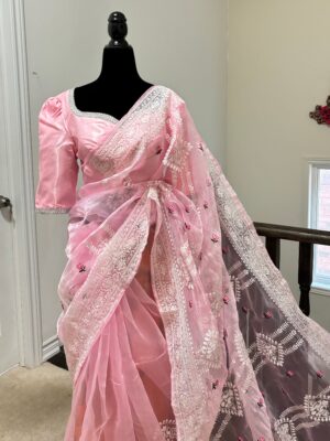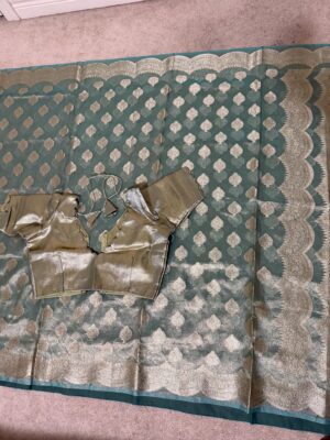 Banarasi organza saree with beautiful chiken Kari all over the saree. Saree is ready with beautiful designer blouse that fit to 32-46 Ideal