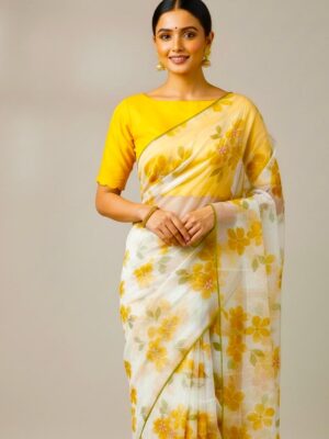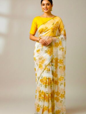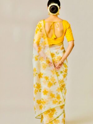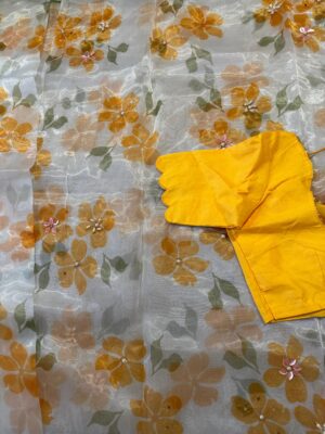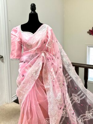 Banarasi kora organza saree with beautiful tie and dye all over the saree. Saree is ready with beautiful designer blouse that fit to 32-46