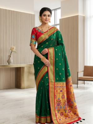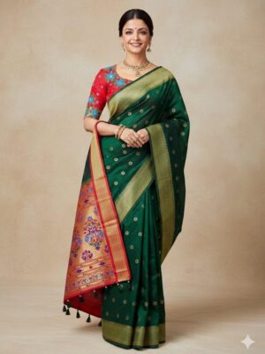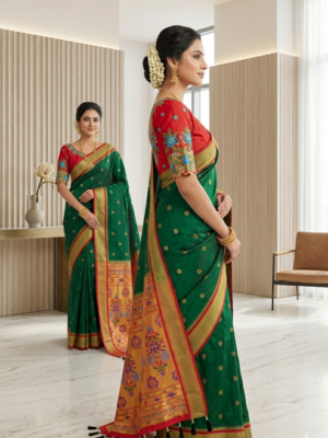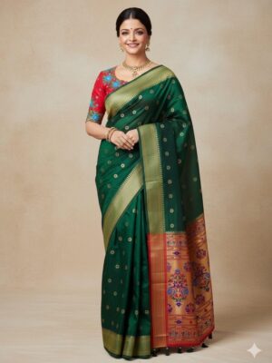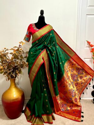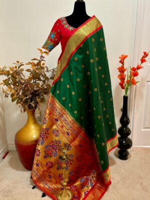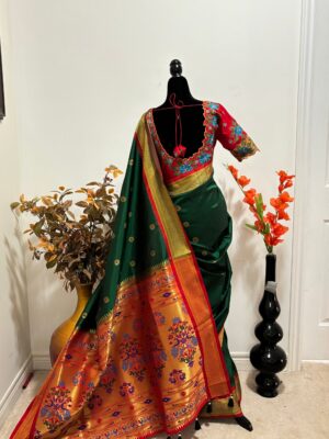 Beautiful Green Pythani Paithani Pure Silk saree with ready to wear beautiful work blouse fits up to 32 to 46 Bottle green color, saree is ready to wear
