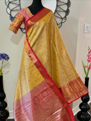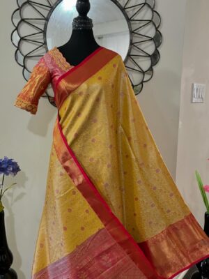 Kanchipuram tissue silk saree in rare colors with beautifully done hand made embroidered blouse with ready to wear work blouse fits 32 to 46