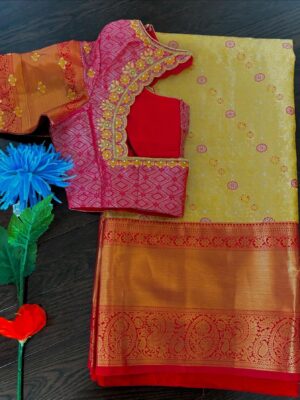 Kanchipuram soft silk saree in rarecolors with beautifully done hand made embroidered blouse with readytowear work blouse fitsup to32 to 46