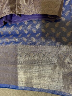 Beautiful Cream Banarasi silk saree paired up with beautiful violet embroidery blouse fits to 32 to 46 in beautiful rare colors all over jaal. Cocktails