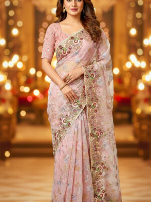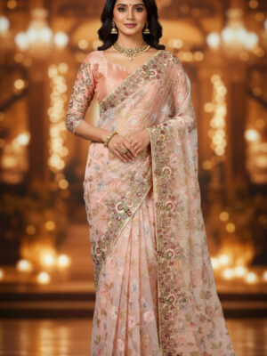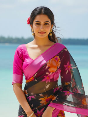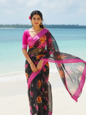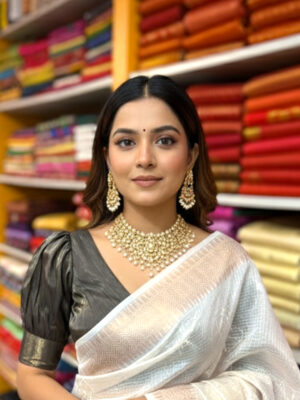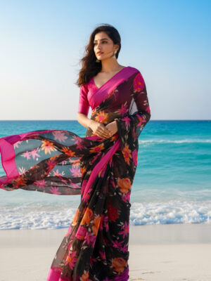 From traditional Nivi drapes to modern pre-stitched or belt-style drapes, the saree is incredibly versatile. Pair it with statement jewelry, a stylish blouse, and matching footwear to complete your look.