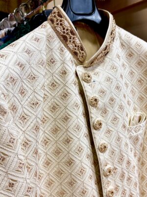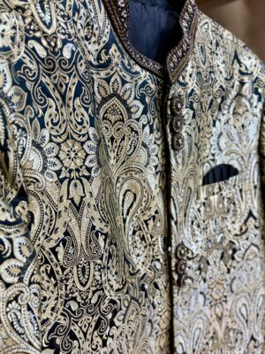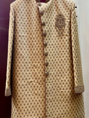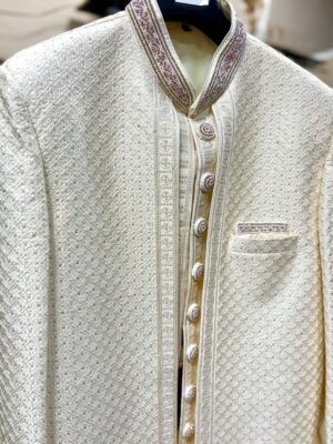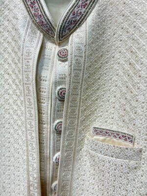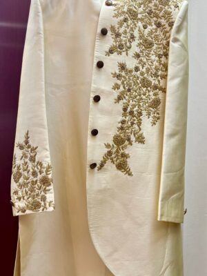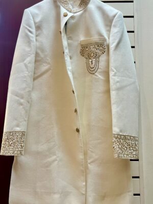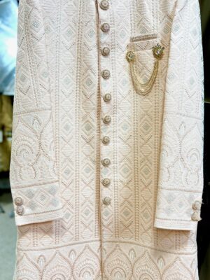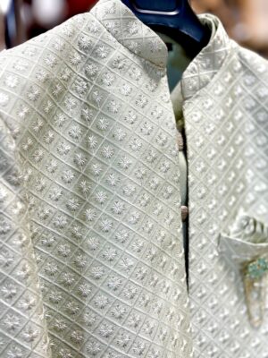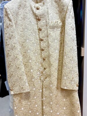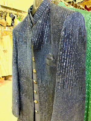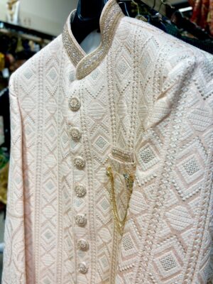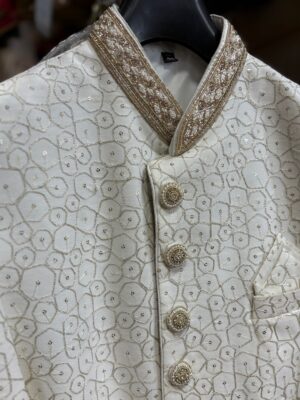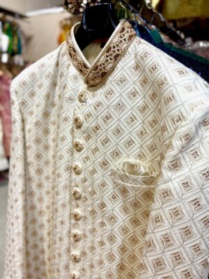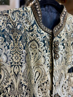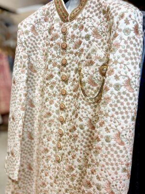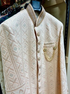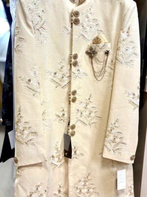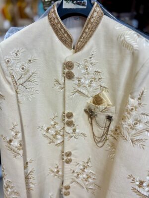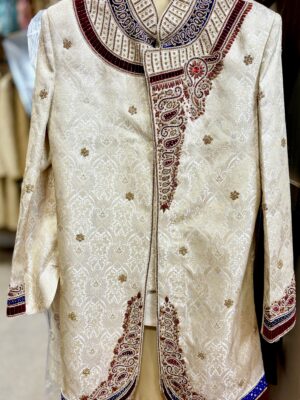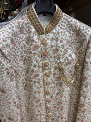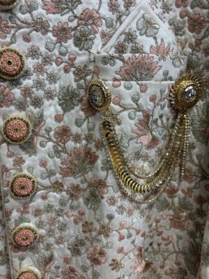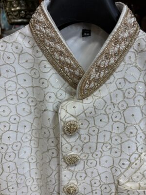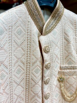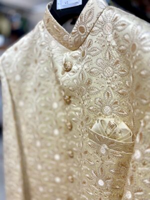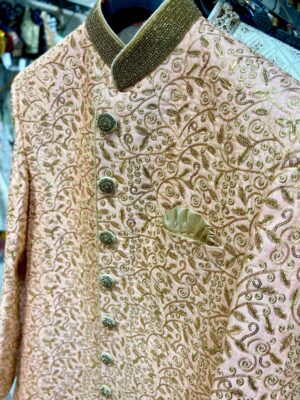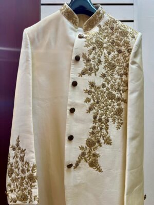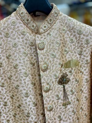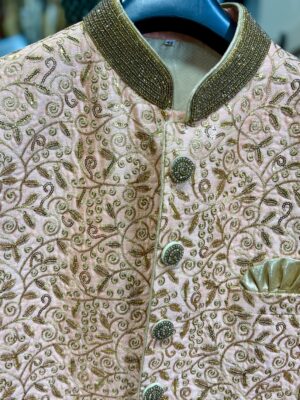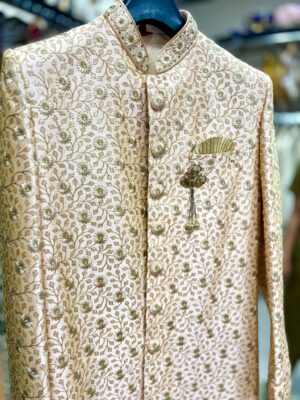 Sherwanis often feature embellishments like zari, resham embroidery, sequins, beads, and stones.