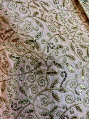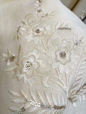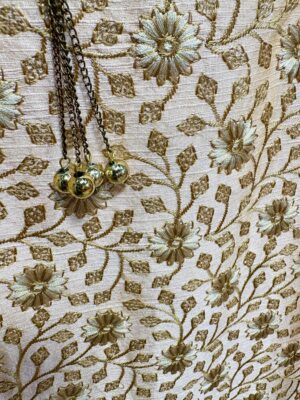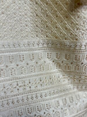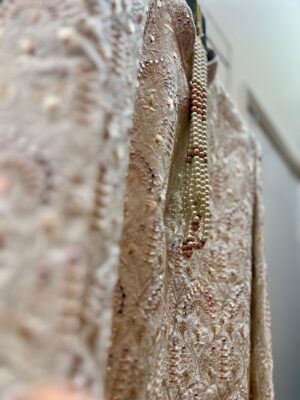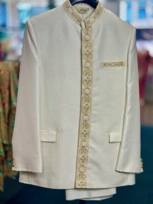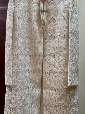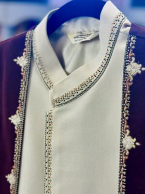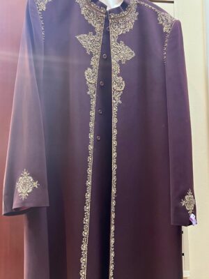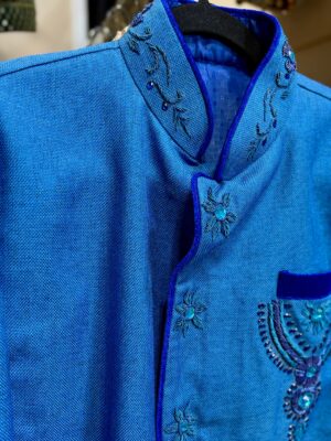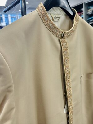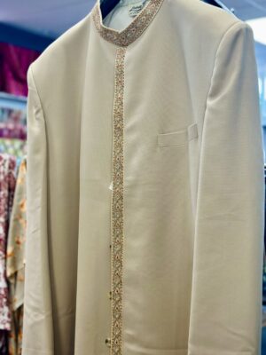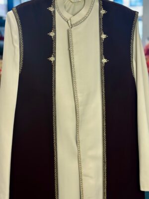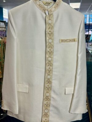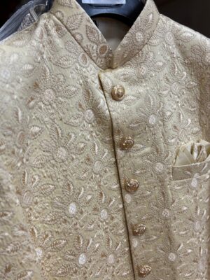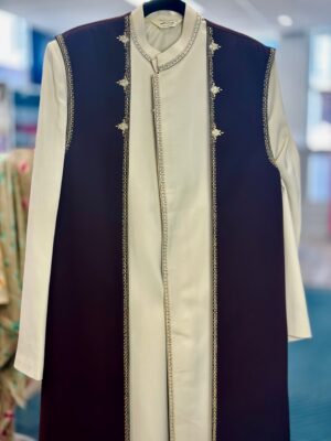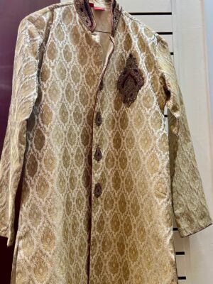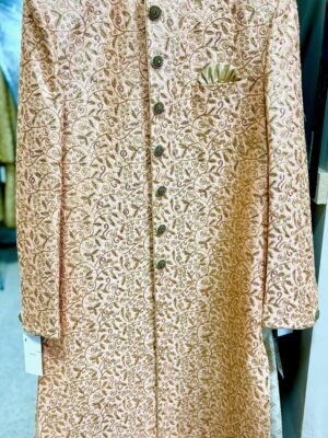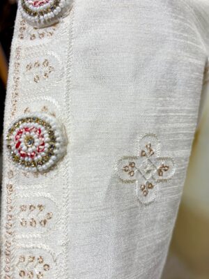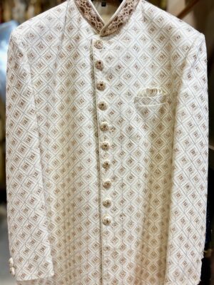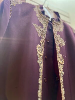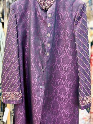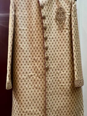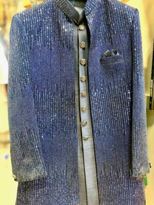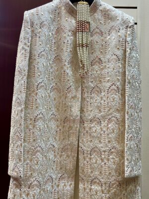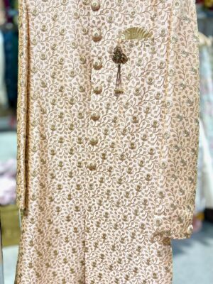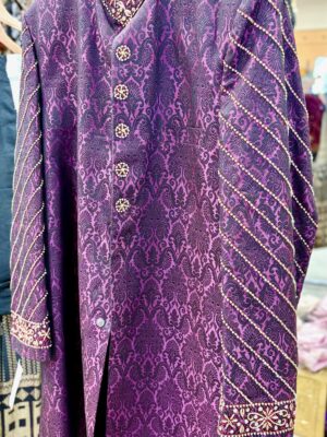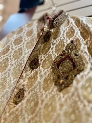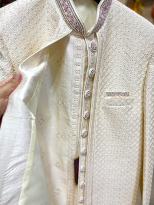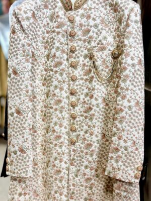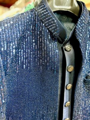 Sherwanis often feature embellishments like zari, resham embroidery, sequins, beads, and stones.