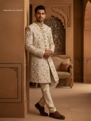 Shopping for sherwanis online gives you access to a wide range of styles, fabrics, and regional designs. You can explore detailed measurements, zoom into embroidery, compare trends, and choose the perfect outfit—all from home.