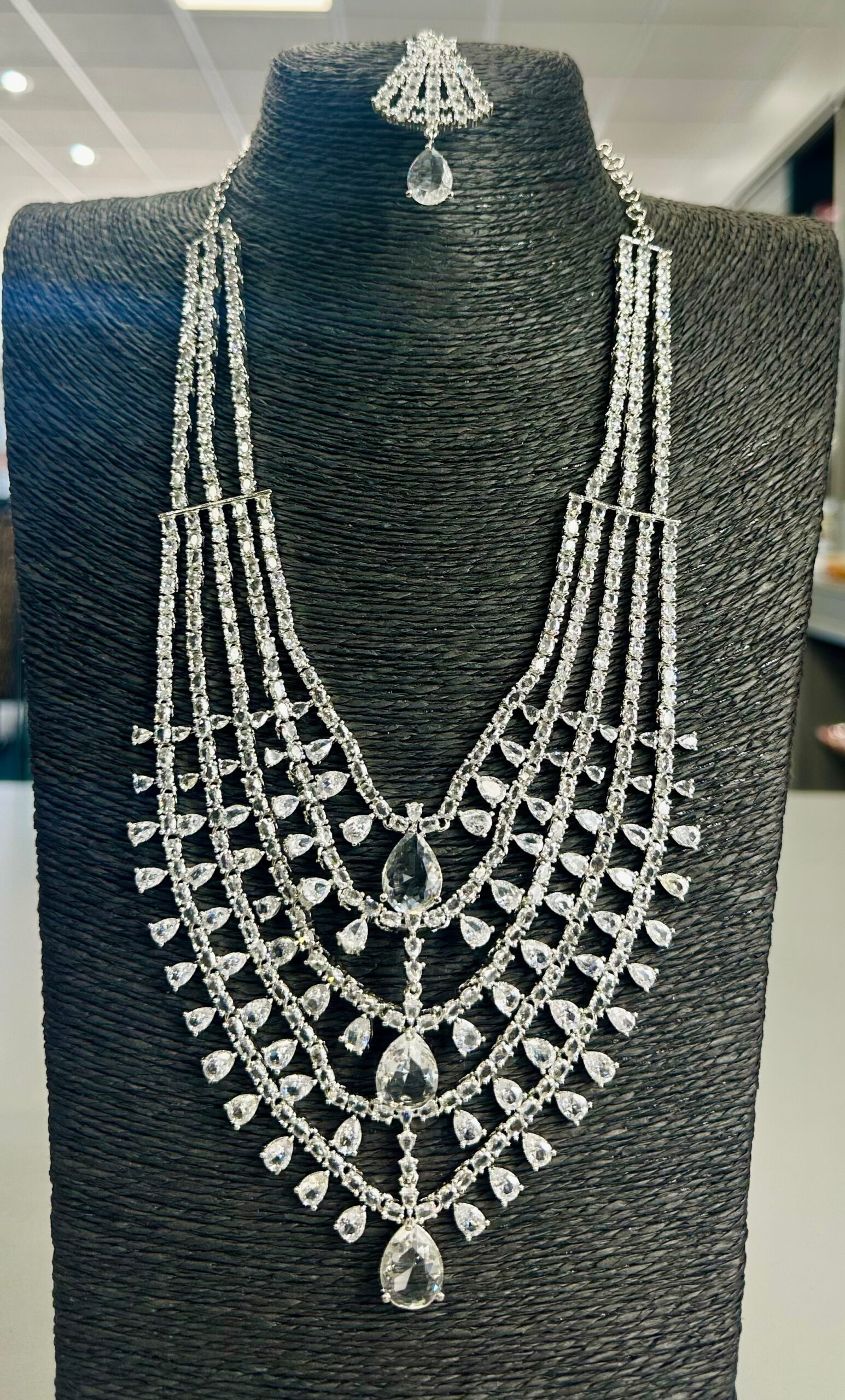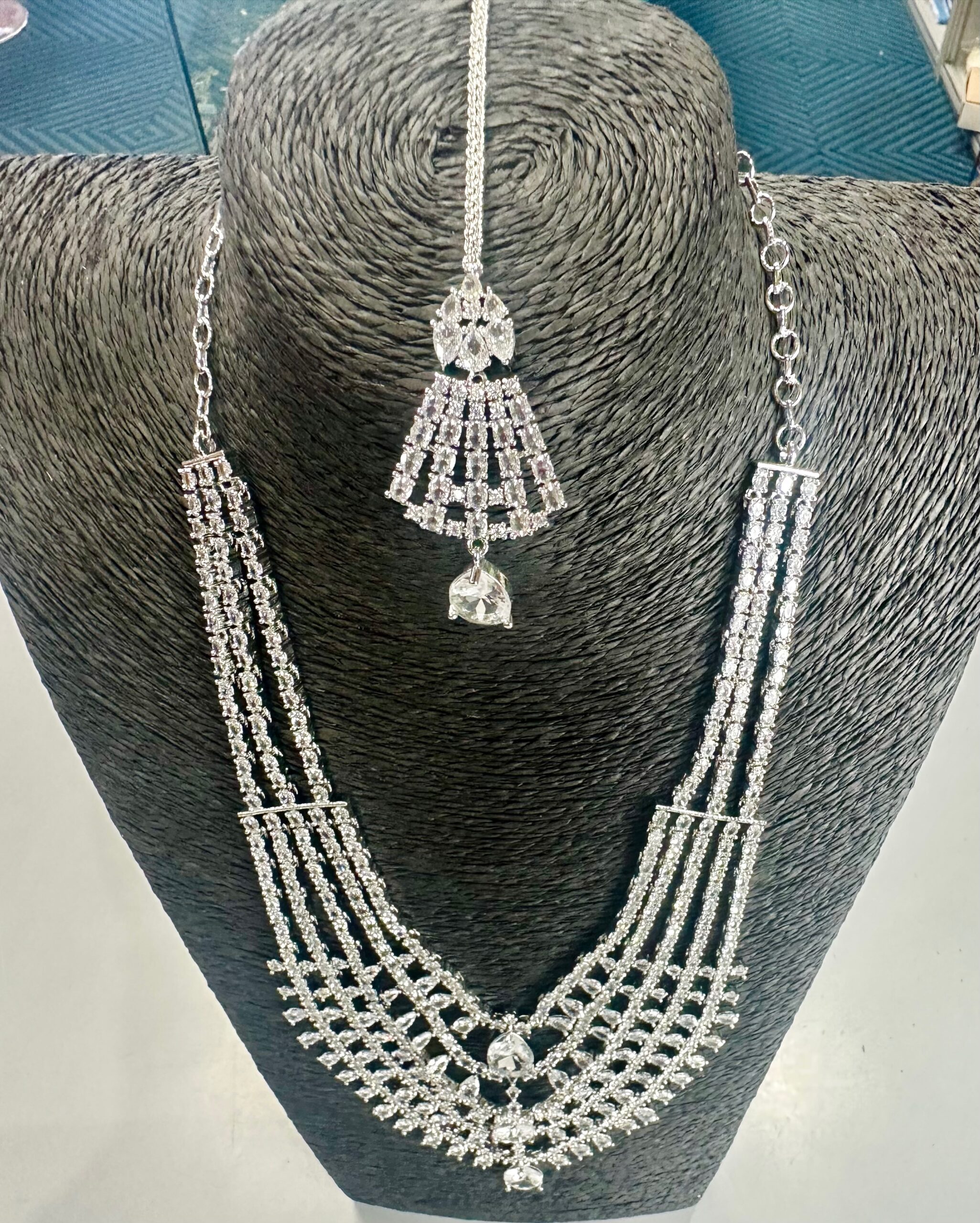 Add timeless sparkle to your style with this exquisite Silver A.D. Haar Set, crafted for the modern woman who loves a touch of tradition with a contemporary twist. Embellished with high-quality American Diamonds, this long necklace set exudes elegance, making it perfect for both day and evening occasions.