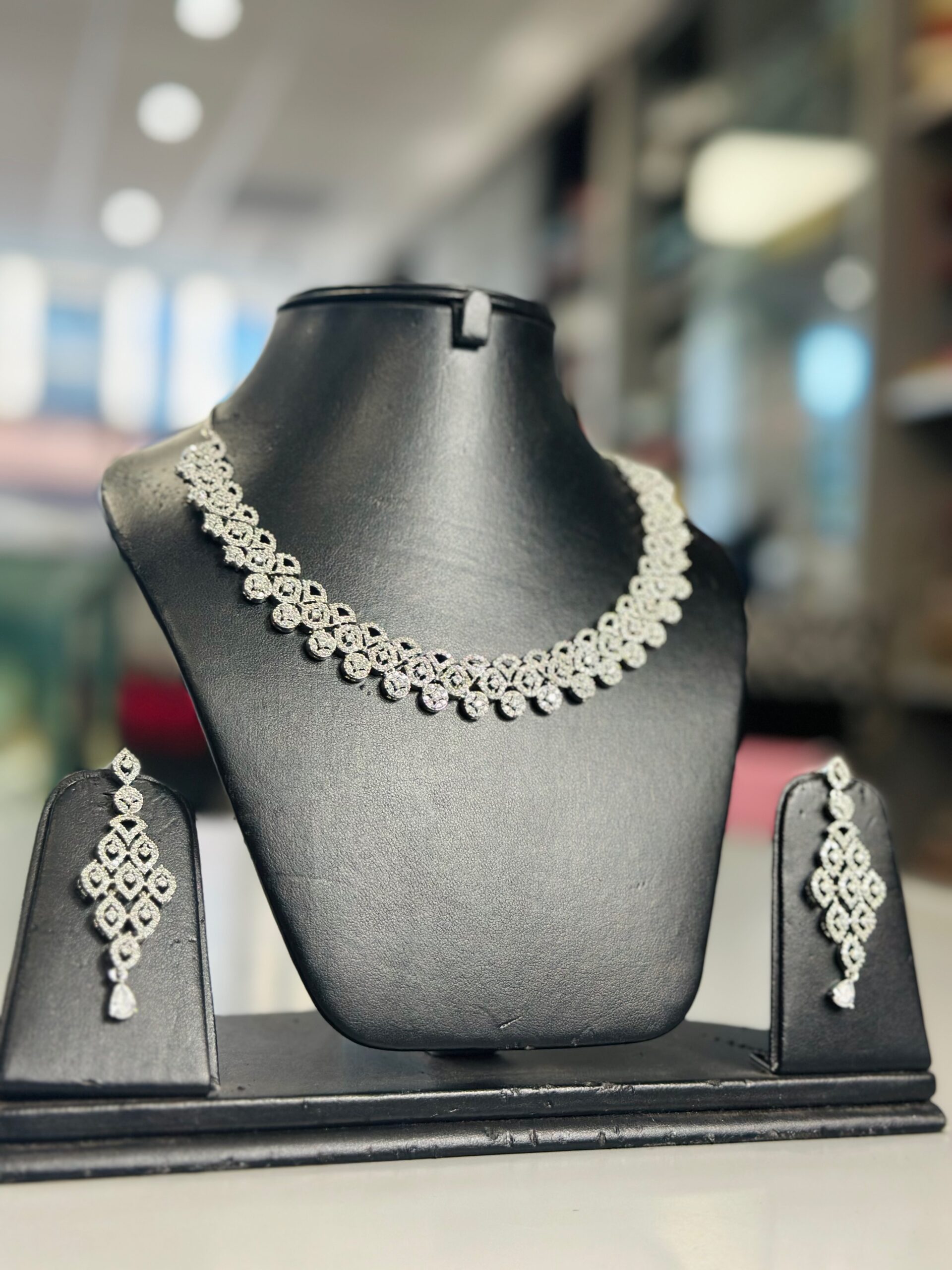 Design: Elegant necklace set with premium A.D. stones in a timeless silver-tone setting
