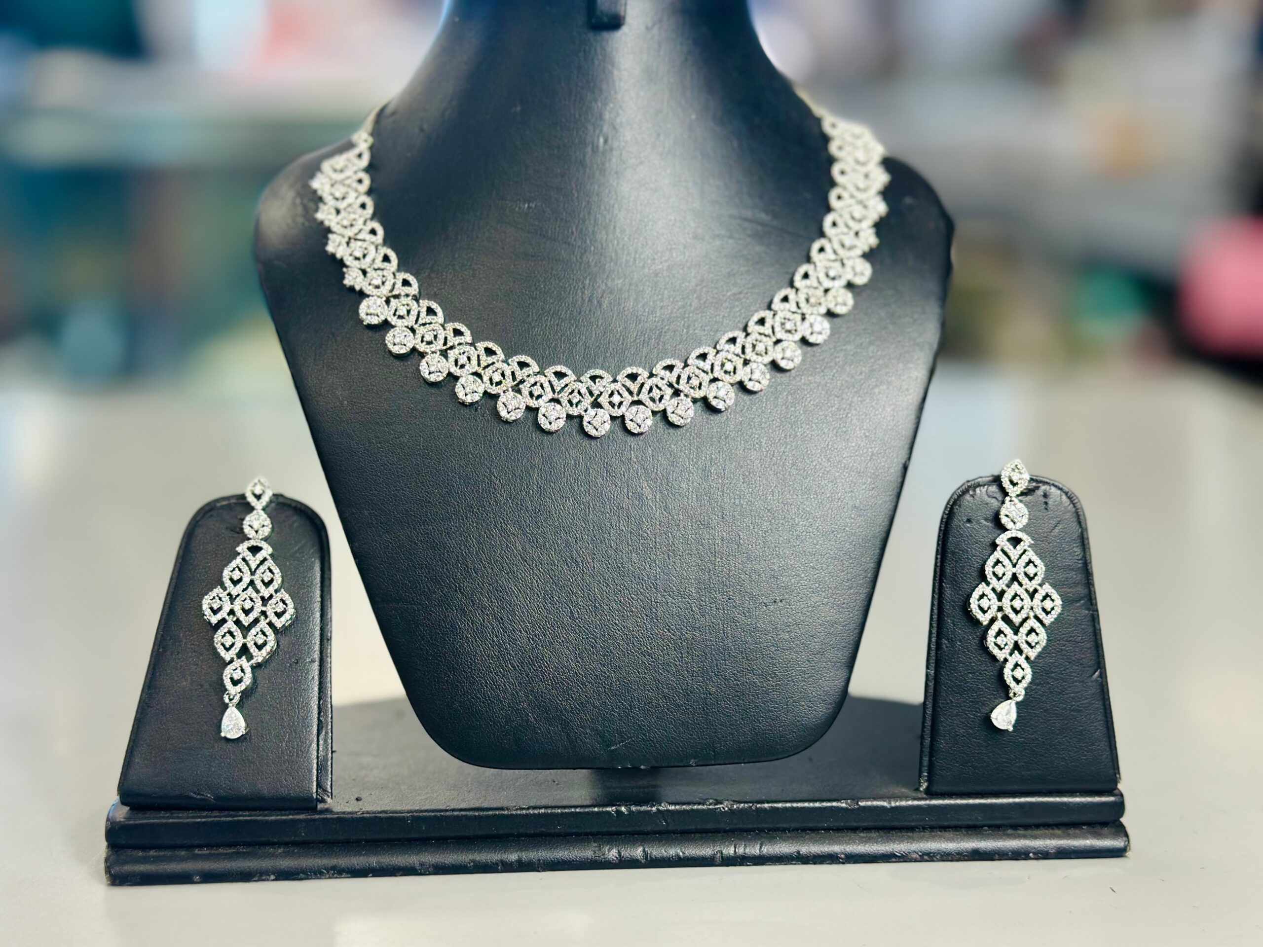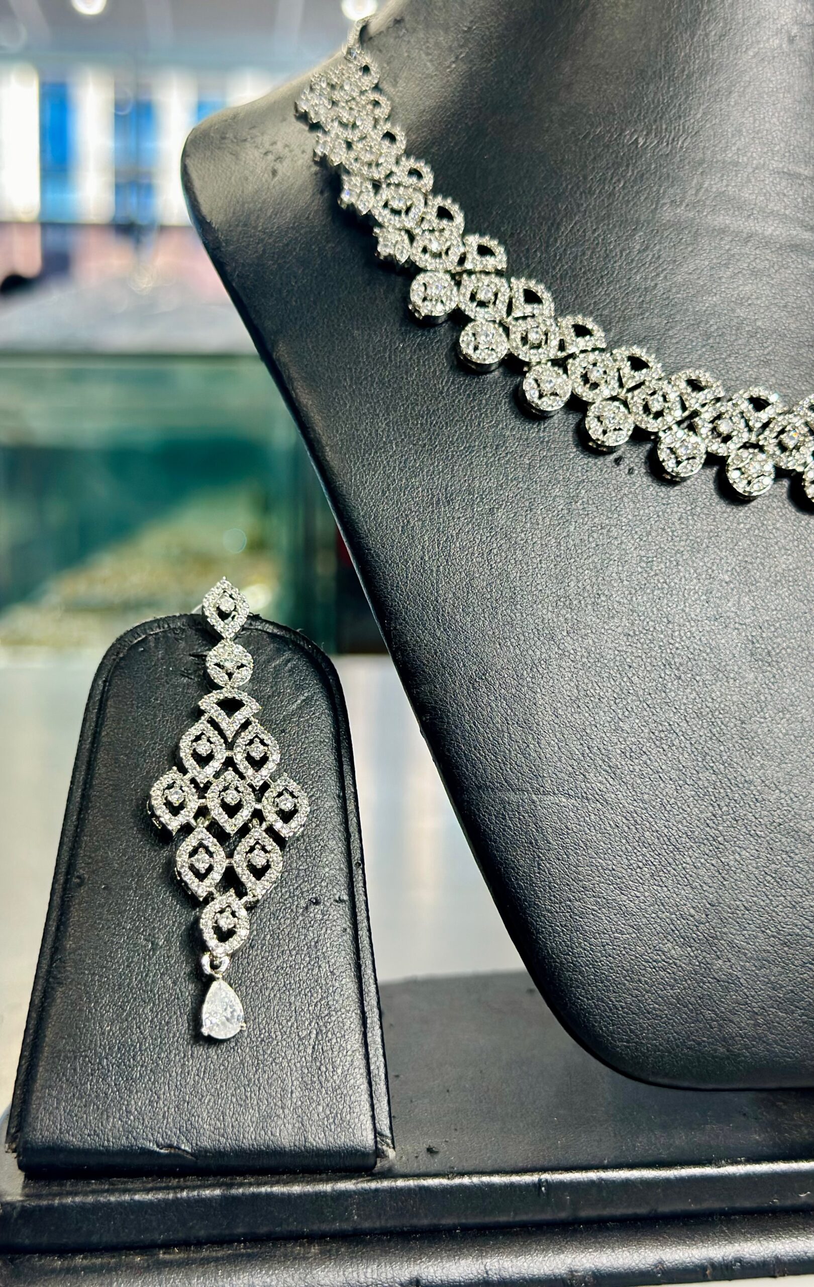Shine with sophistication in this stunning Silver A.D. Set, designed to capture the brilliance of real diamonds in a sleek, silver finish. Featuring finely cut American Diamonds set in a contemporary design, this set is perfect for both traditional and modern looks.