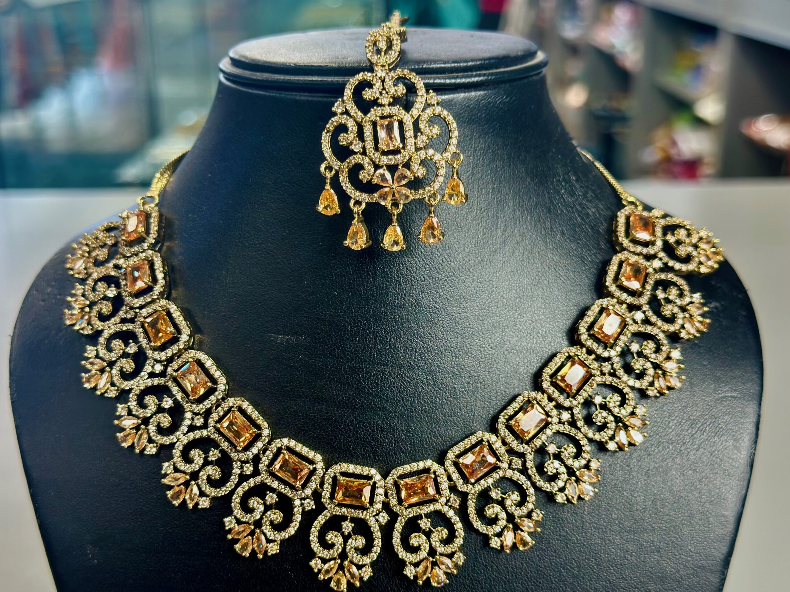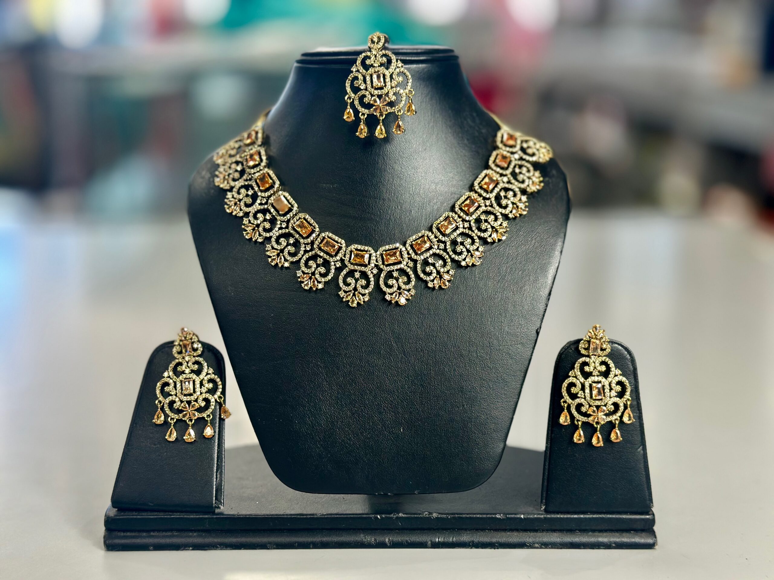 Grace your neckline with this luxurious Gold LCT American Diamond Set, where the brilliance of finely cut AD stones meets the richness of a Light Champagne Tone (LCT) gold finish. This set combines the timeless allure of traditional design with the sparkle of modern elegance.