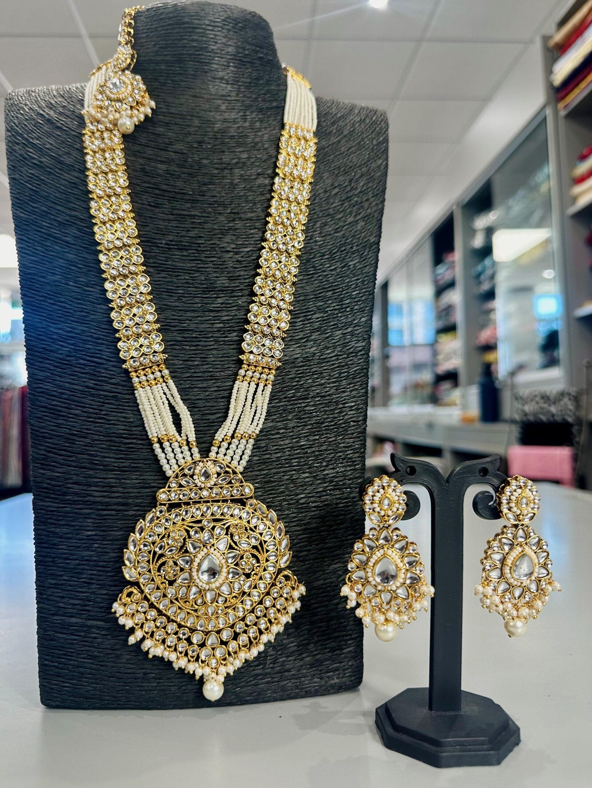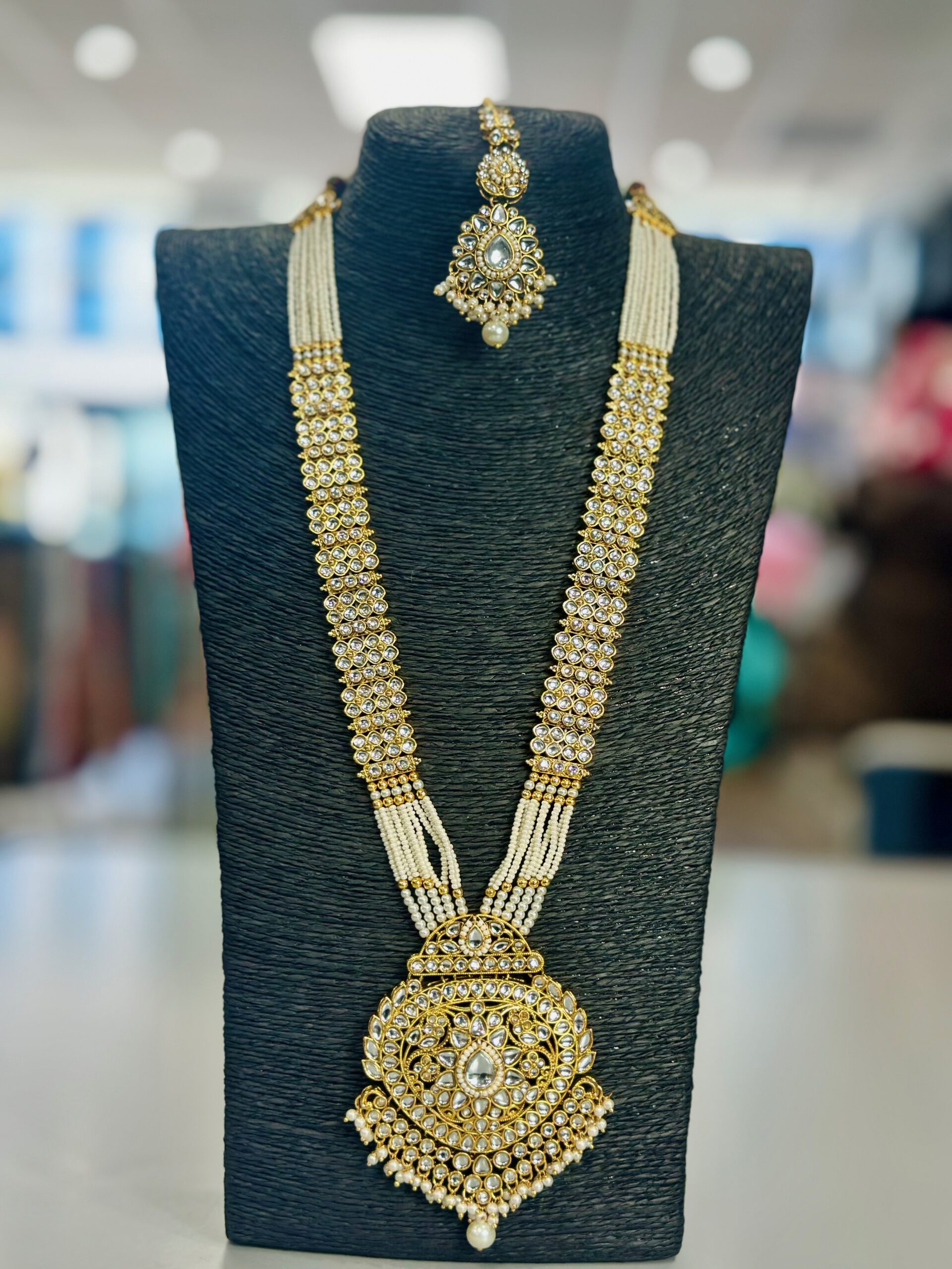 Design: Long, layered haar with authentic Kundan work for a regal, heritage-inspired look