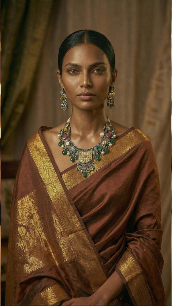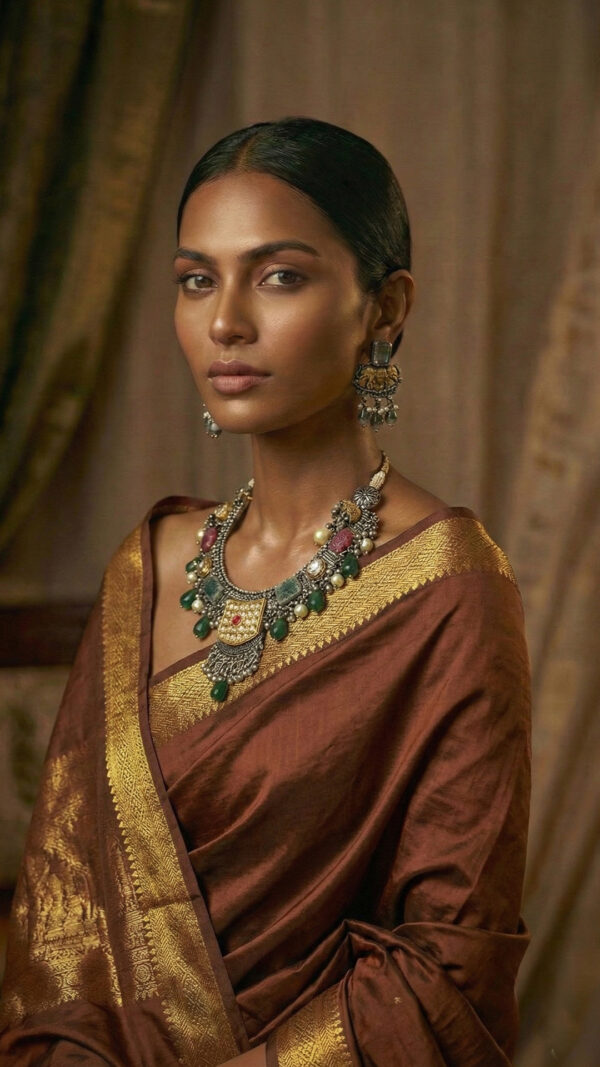 - Color Palette: Warm gold, oxidized silver, deep green, wine red, and ivory accents