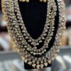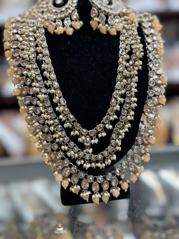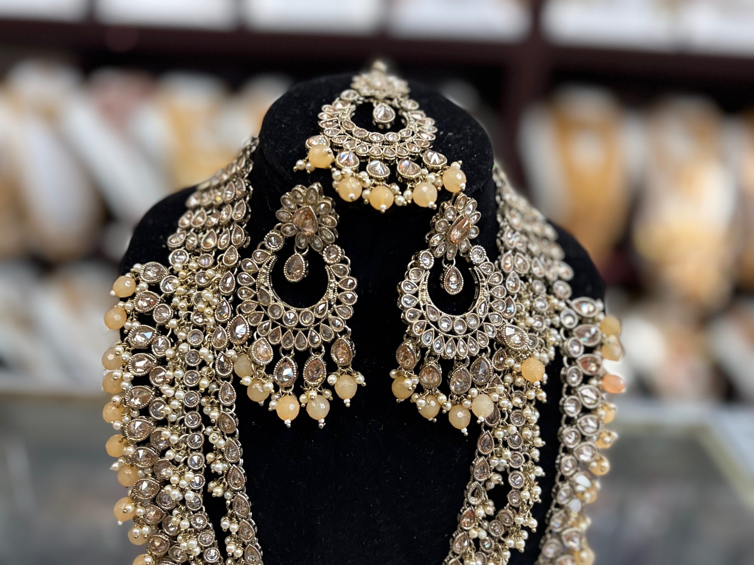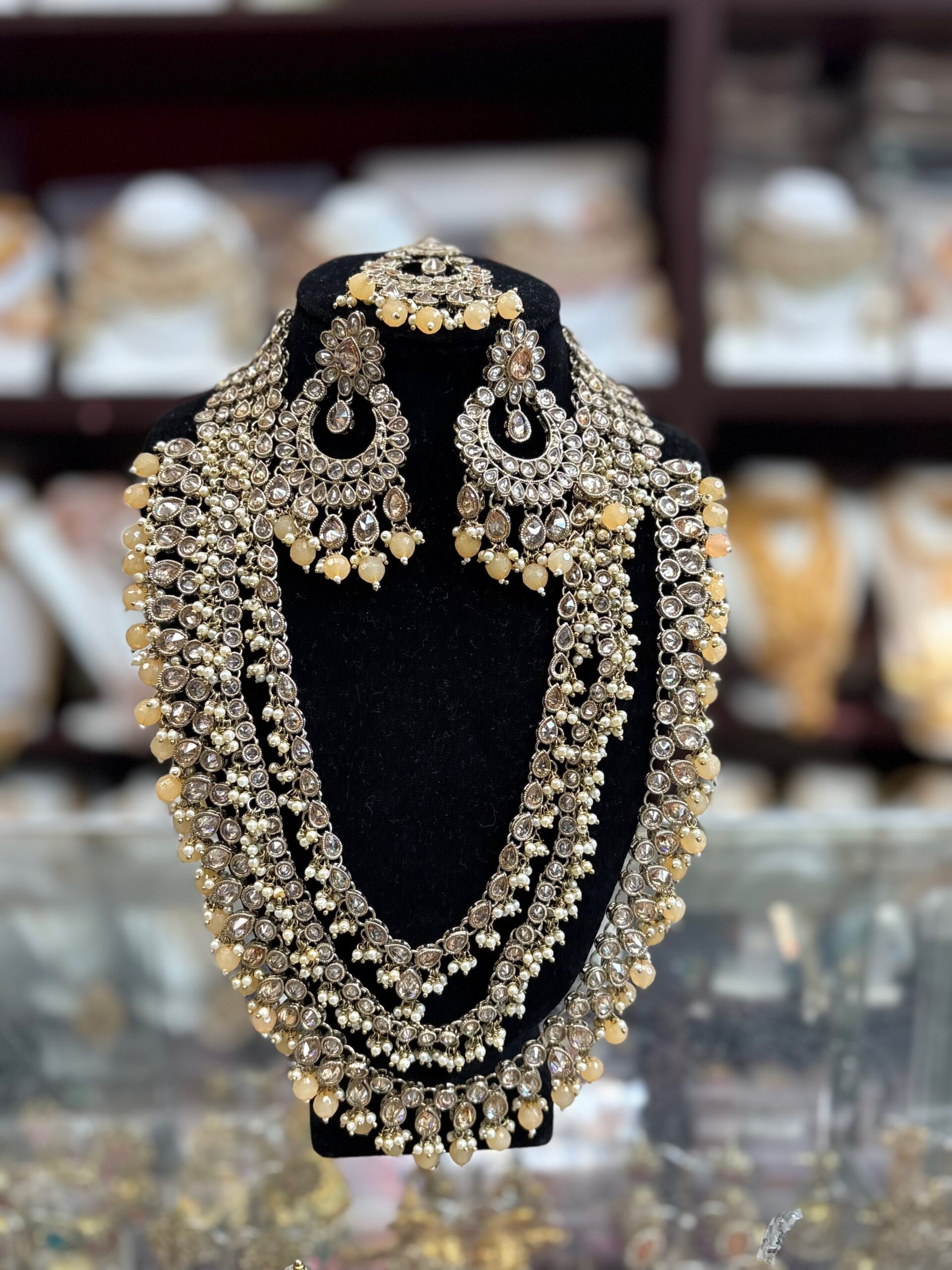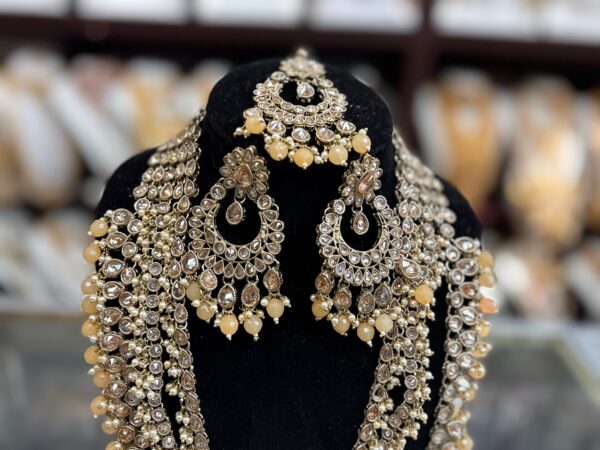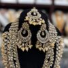 Corn Yellow White Stone Pearl Necklace Earring Maang Tikka Jewelry Set