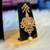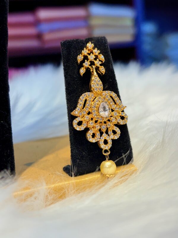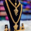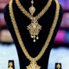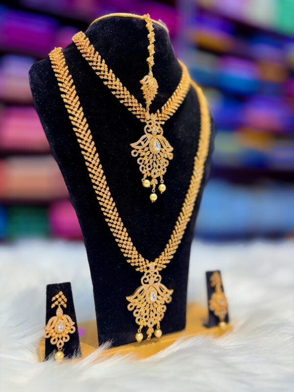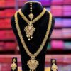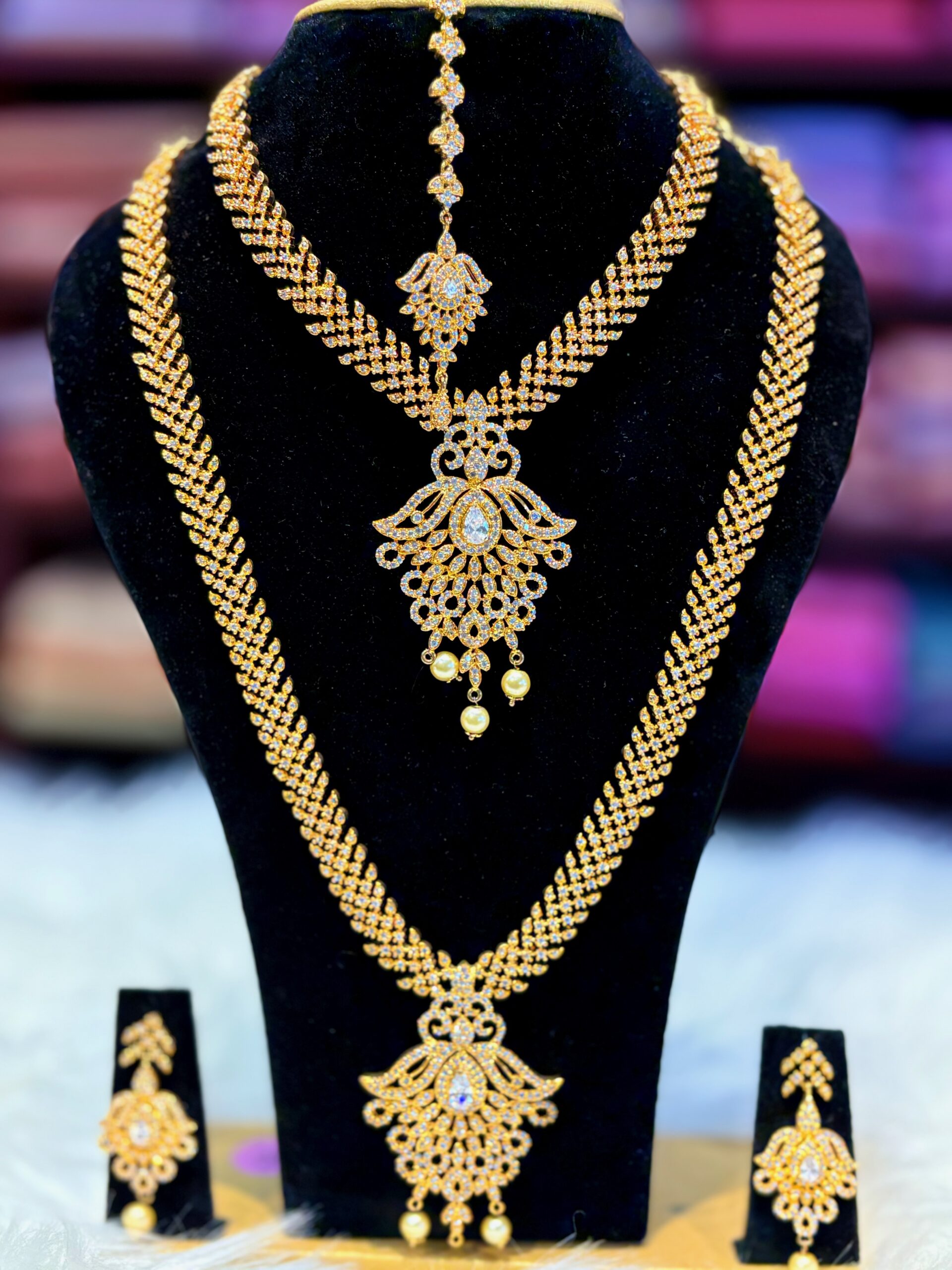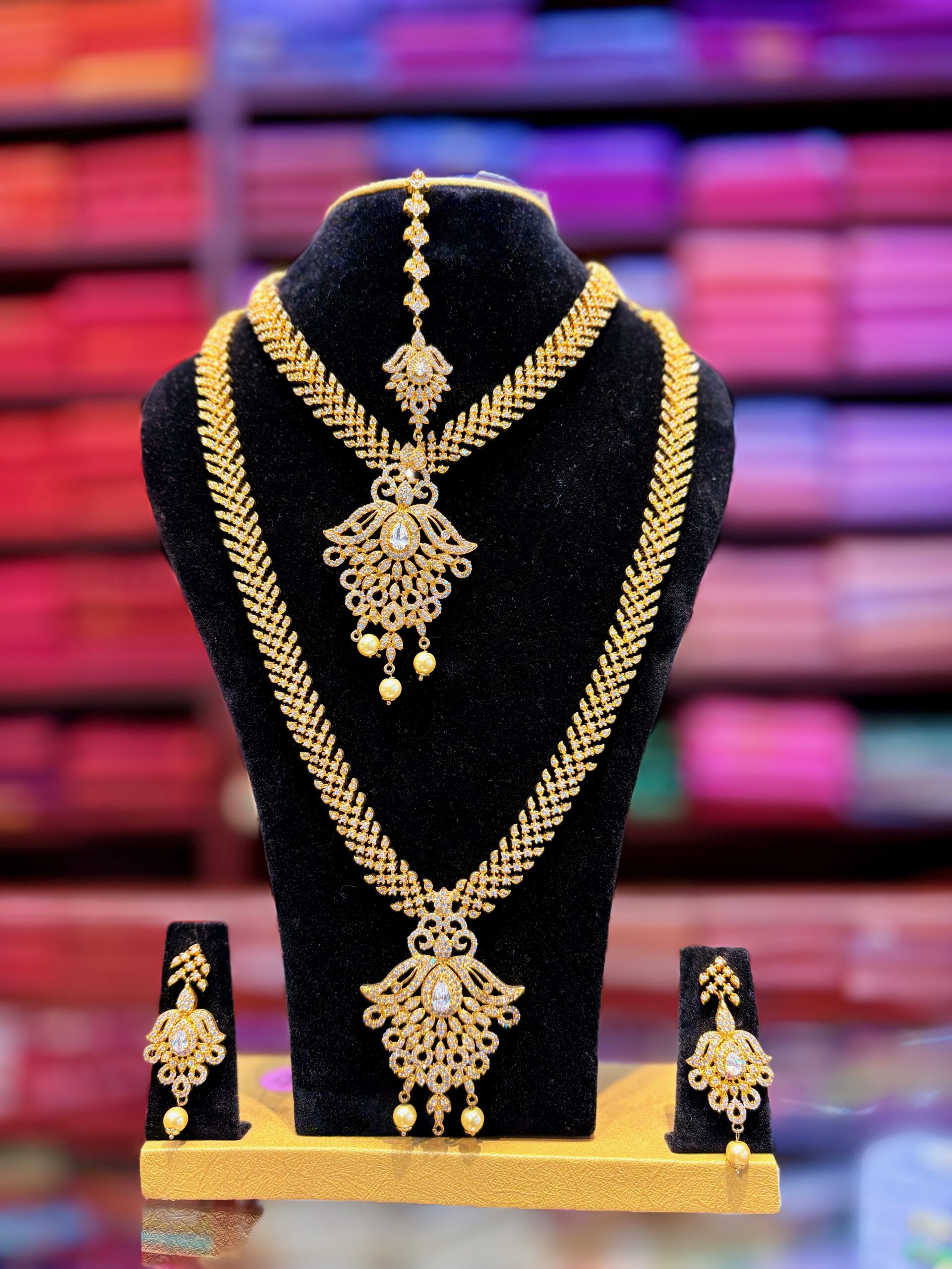 This beautiful gold plated jewelry set decorated with American Diamond AD stones consists of two necklaces – Long Aaram Necklace & Short Necklace , Earrings and Maang Tikka/ Uchchi pattam ideal for bridal, wedding or wedding anniversary.