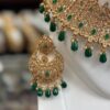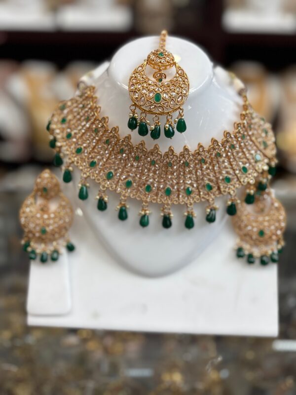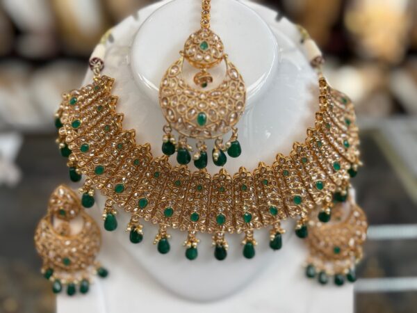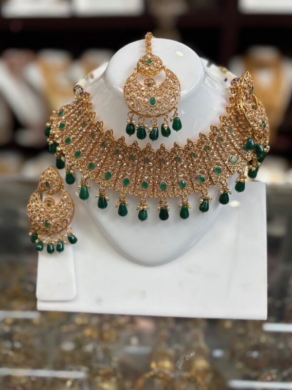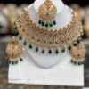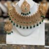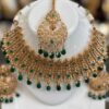Gold Choker Kundan Necklace Earring Maang Tikka White Stone Green Stone Pearl Indian Jewelry Set
