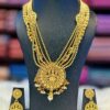Gold Plated Jewelry Set with pearl – Gold Lakshmi 4 Layered Aaram Necklace paired with Jhumka Earrings