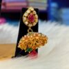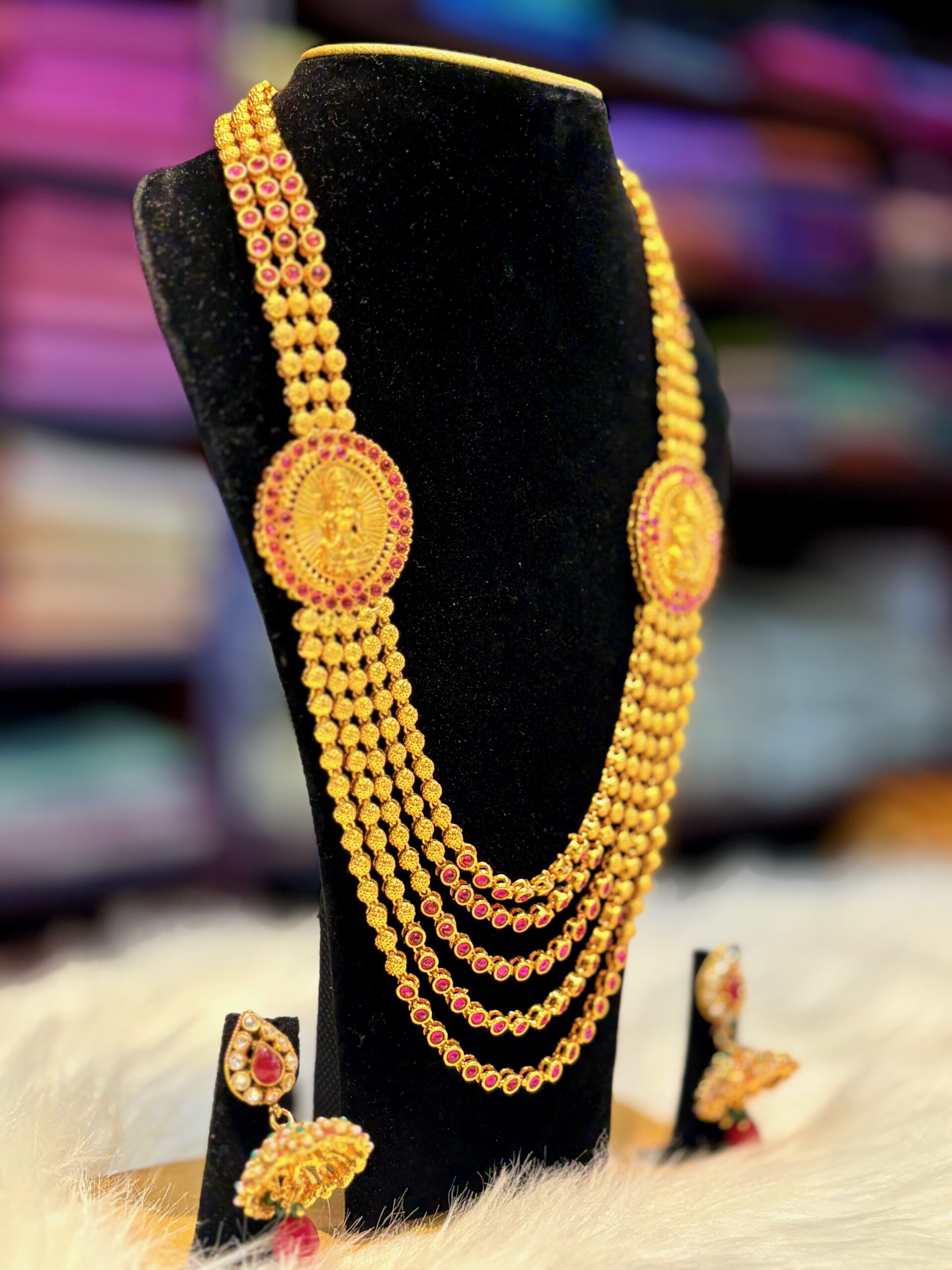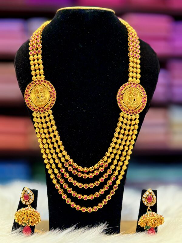 Gold Plated Kundan Jewelry Set – Gold Lakshmi 4 Layered Aaram Necklace paired with Jhumka Earrings with red white stones
