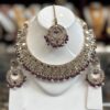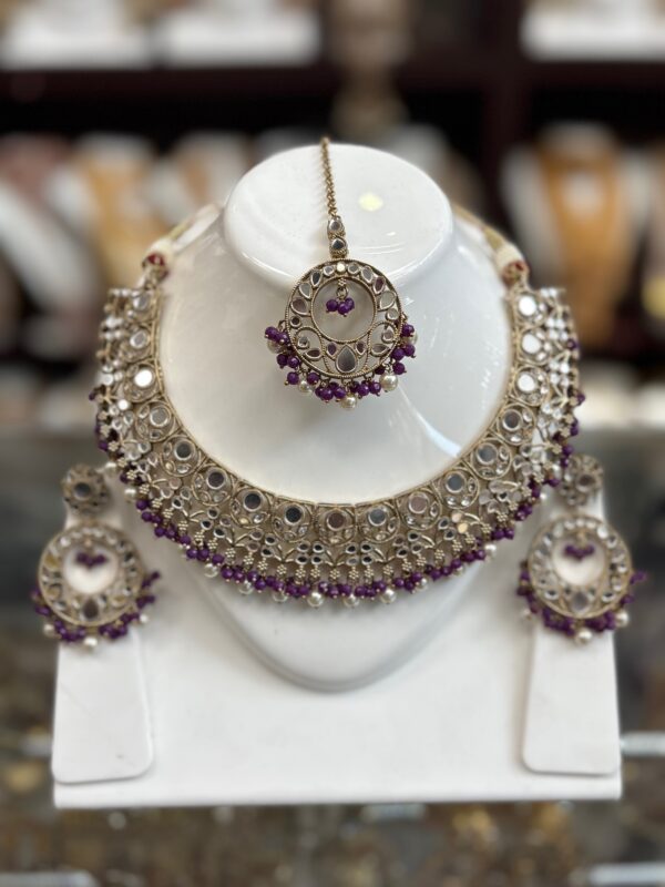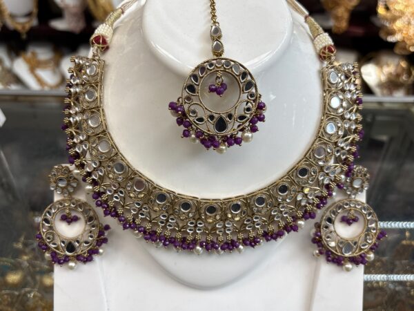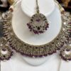 Gold Purple Choker Necklace Earring Maang Tikka White Stone Green Stone Purple Pearl Indian Jewelry Set