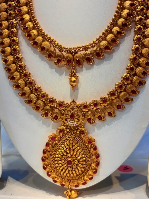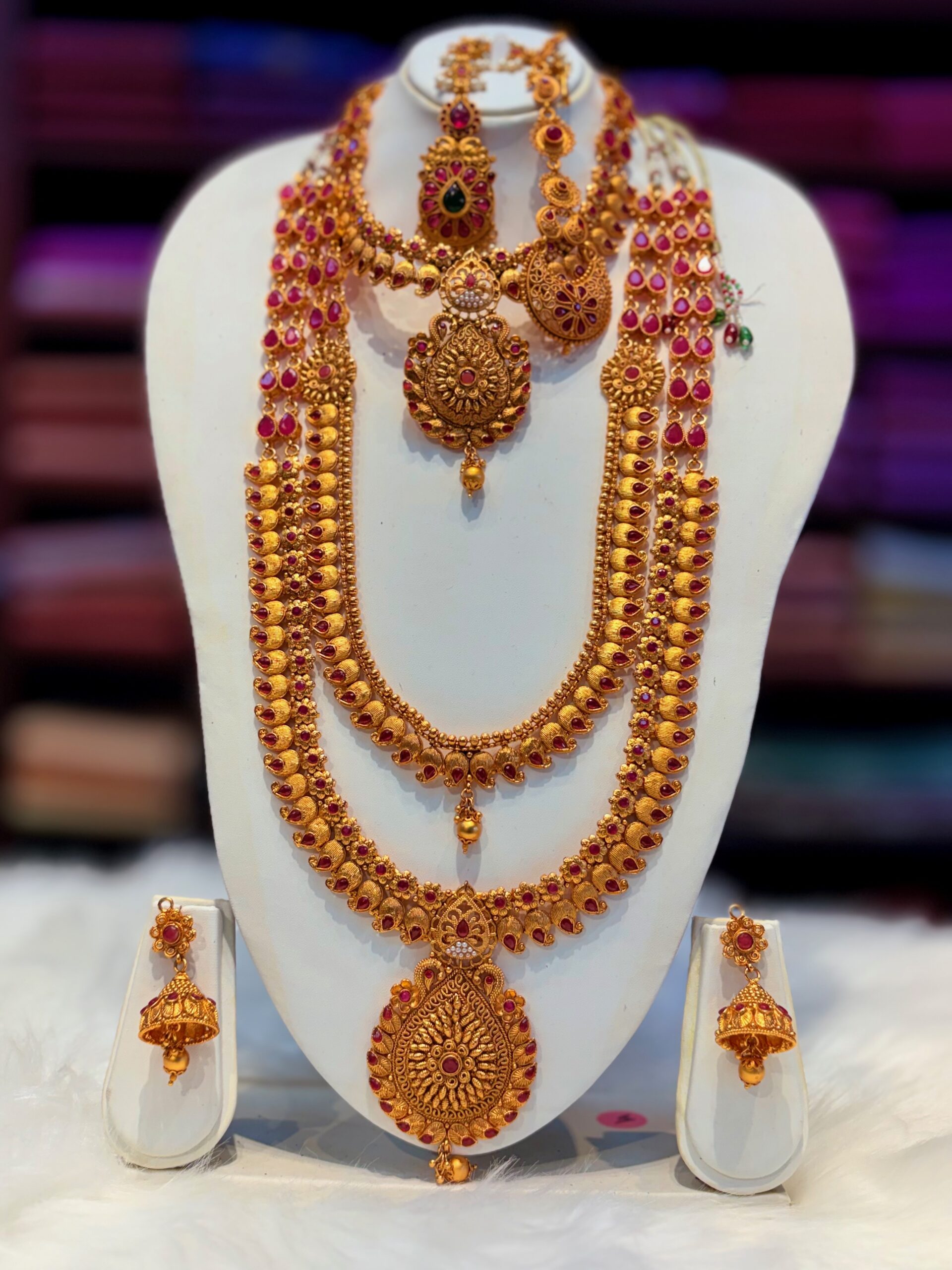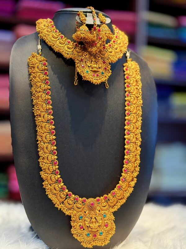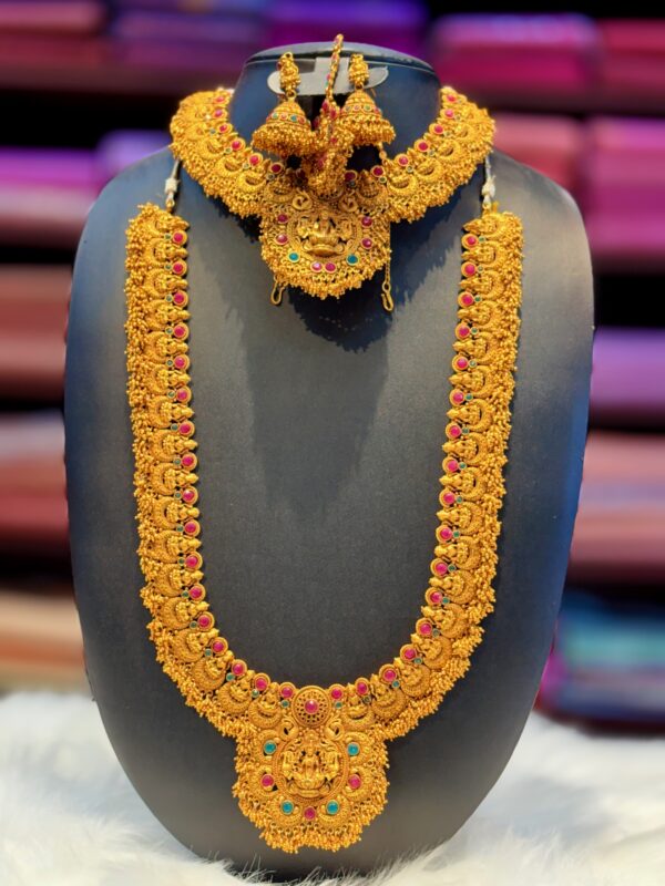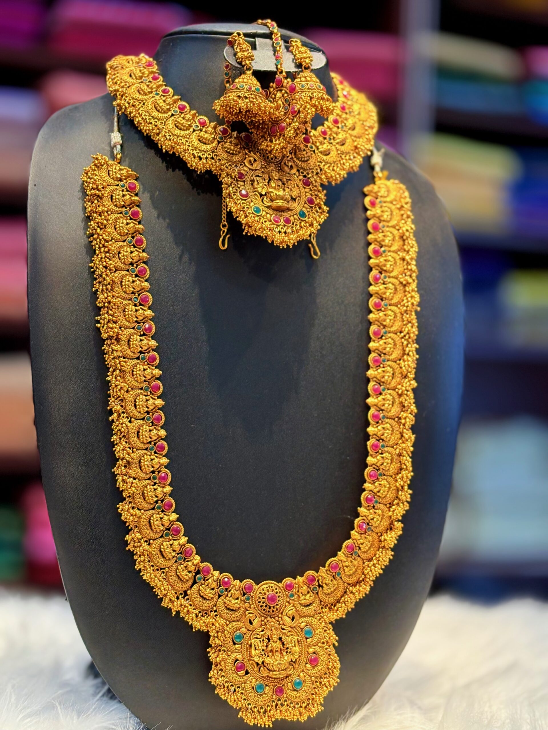Double Chain Necklace & Choker, 2 Earrings/ Jhumka, 2 Maang Tikka/ Uchchi pattam