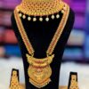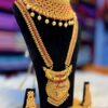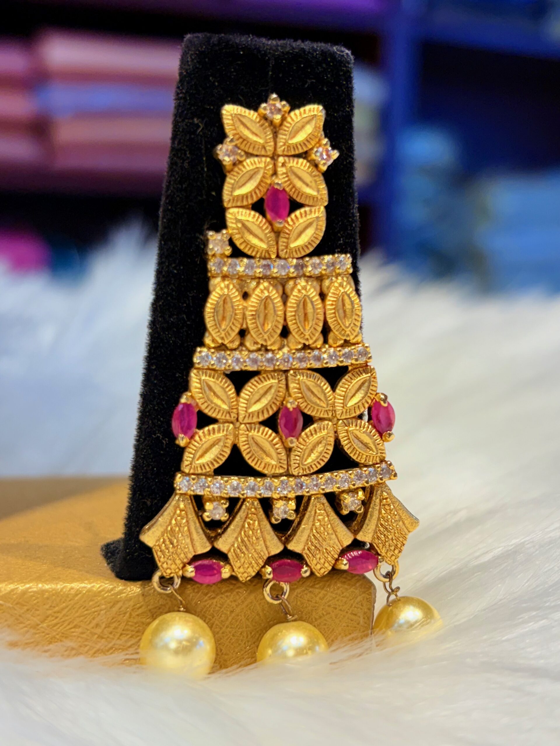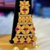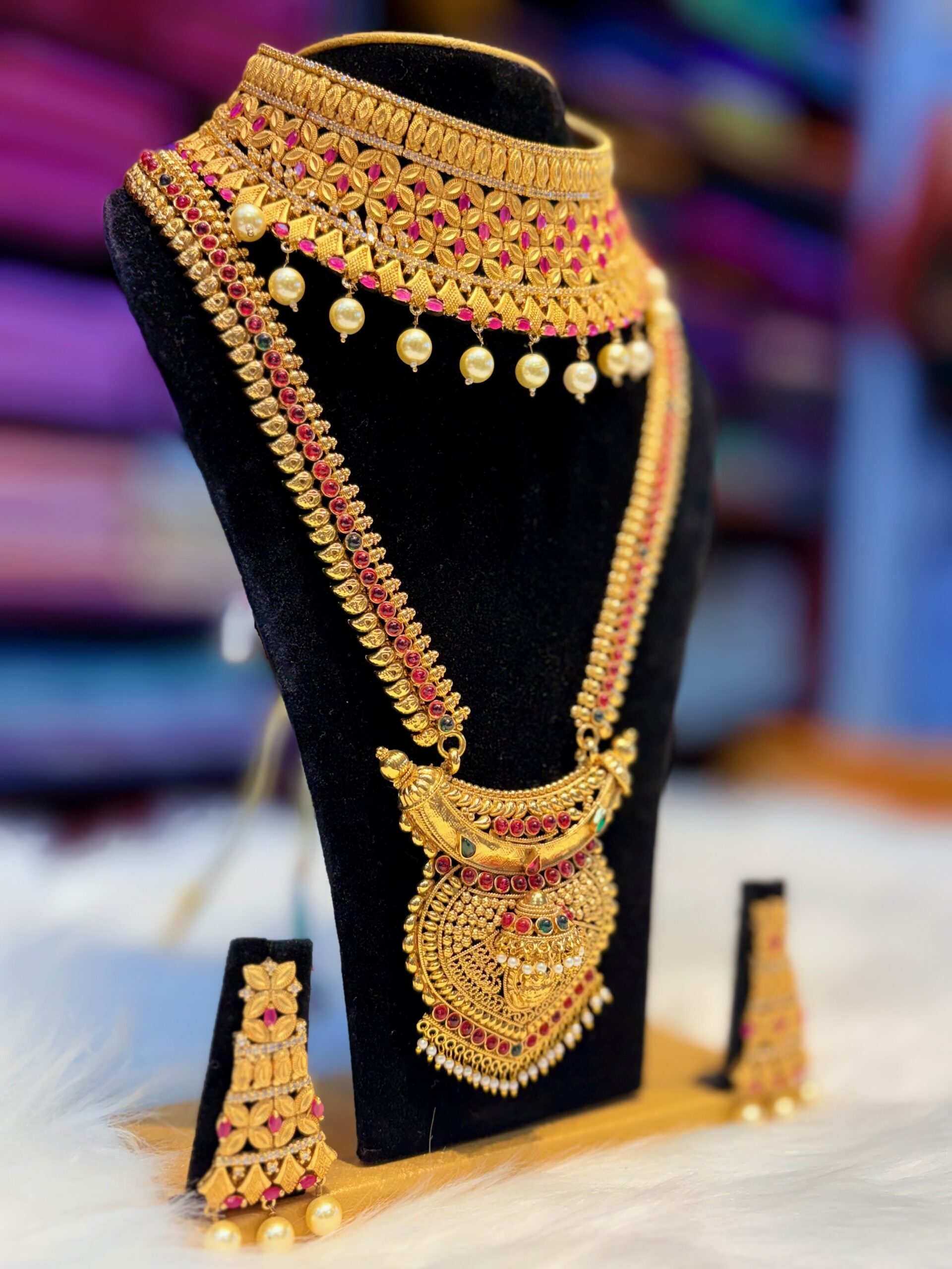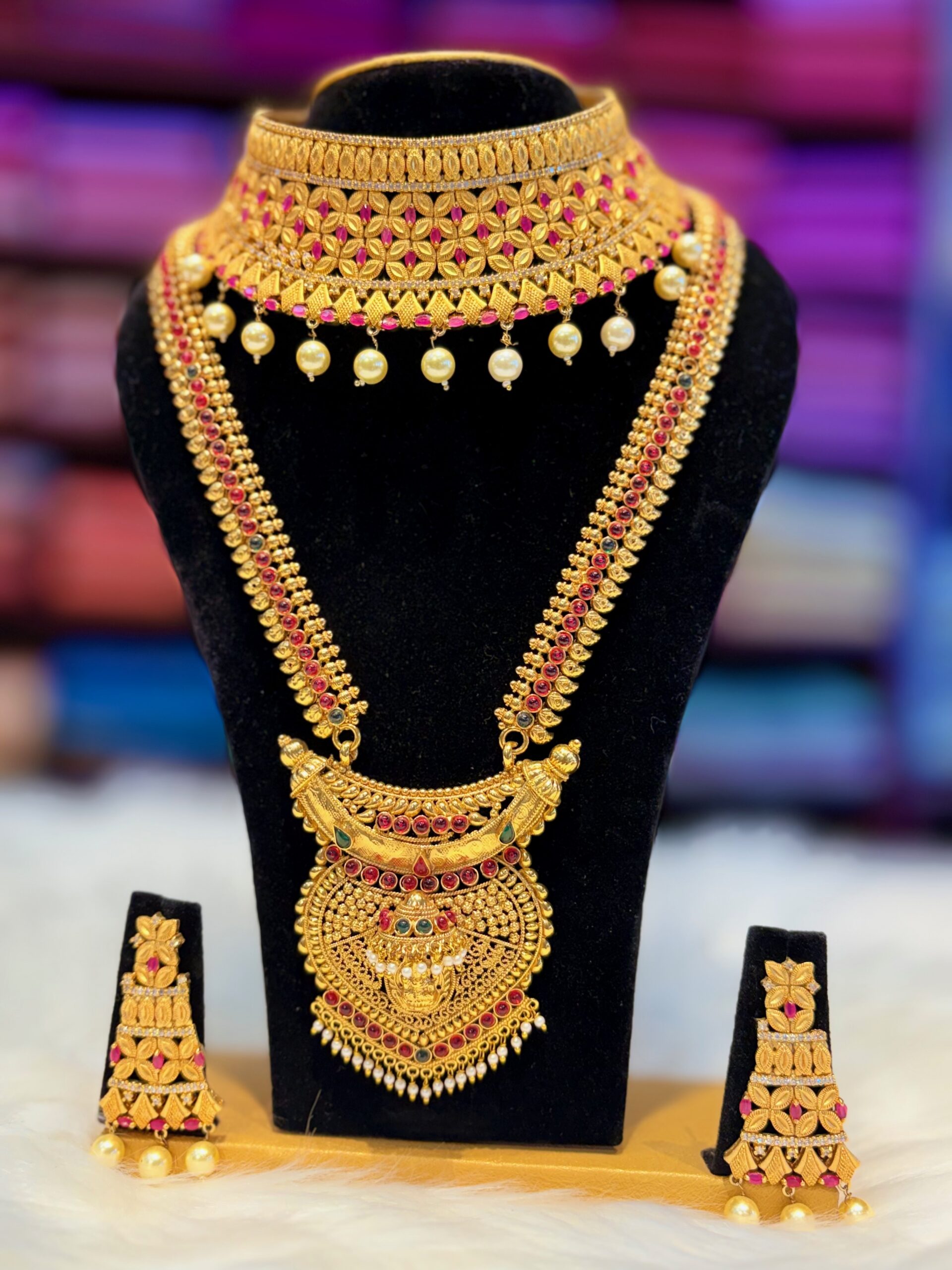 Gold Red Stone White Pearl Jewelry Set – Necklace and Choker, Earrings/ Jhumka Set