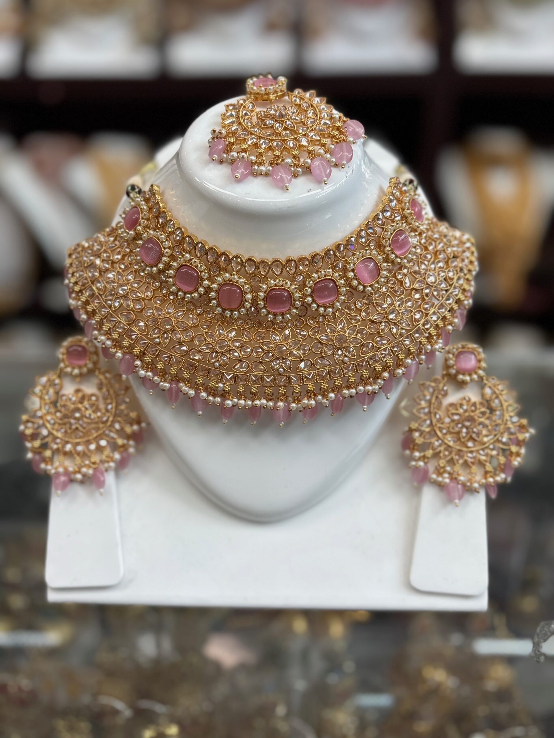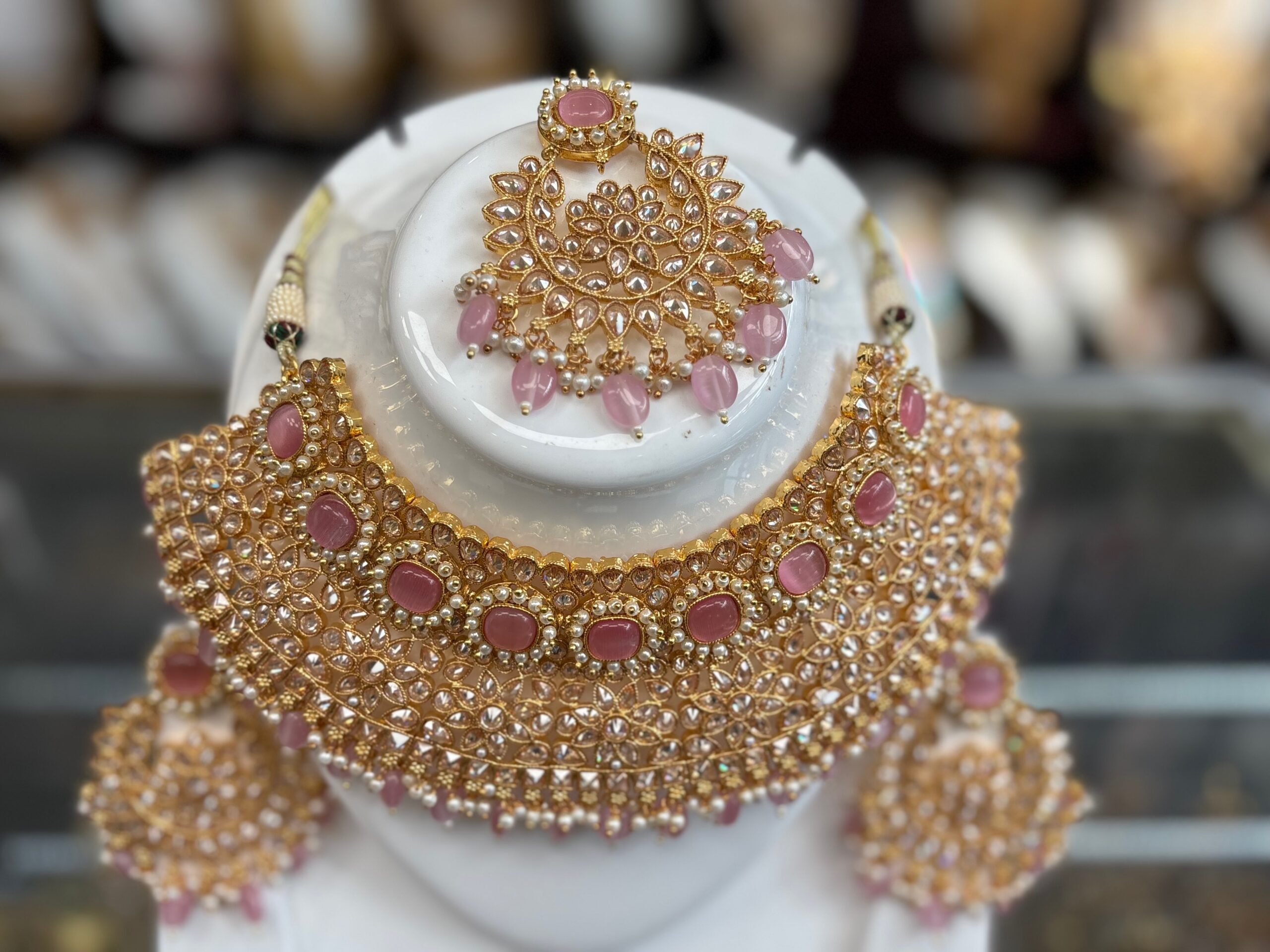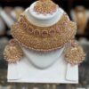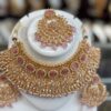 Gold Rose Pink White American Diamond Pearl Stone Kundan Necklace Choker Earring Maang Tikka AD Indian Jewelry Set