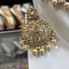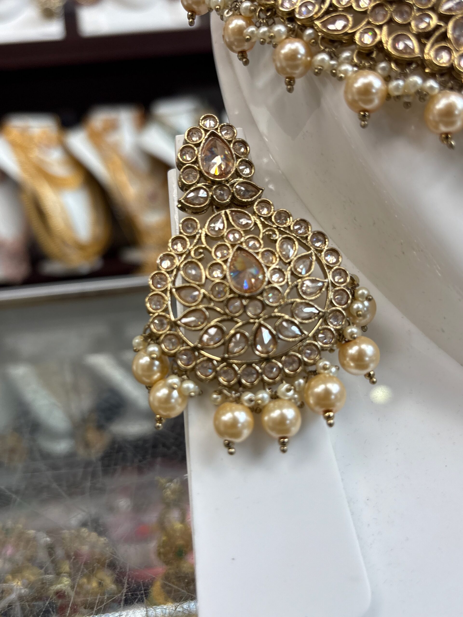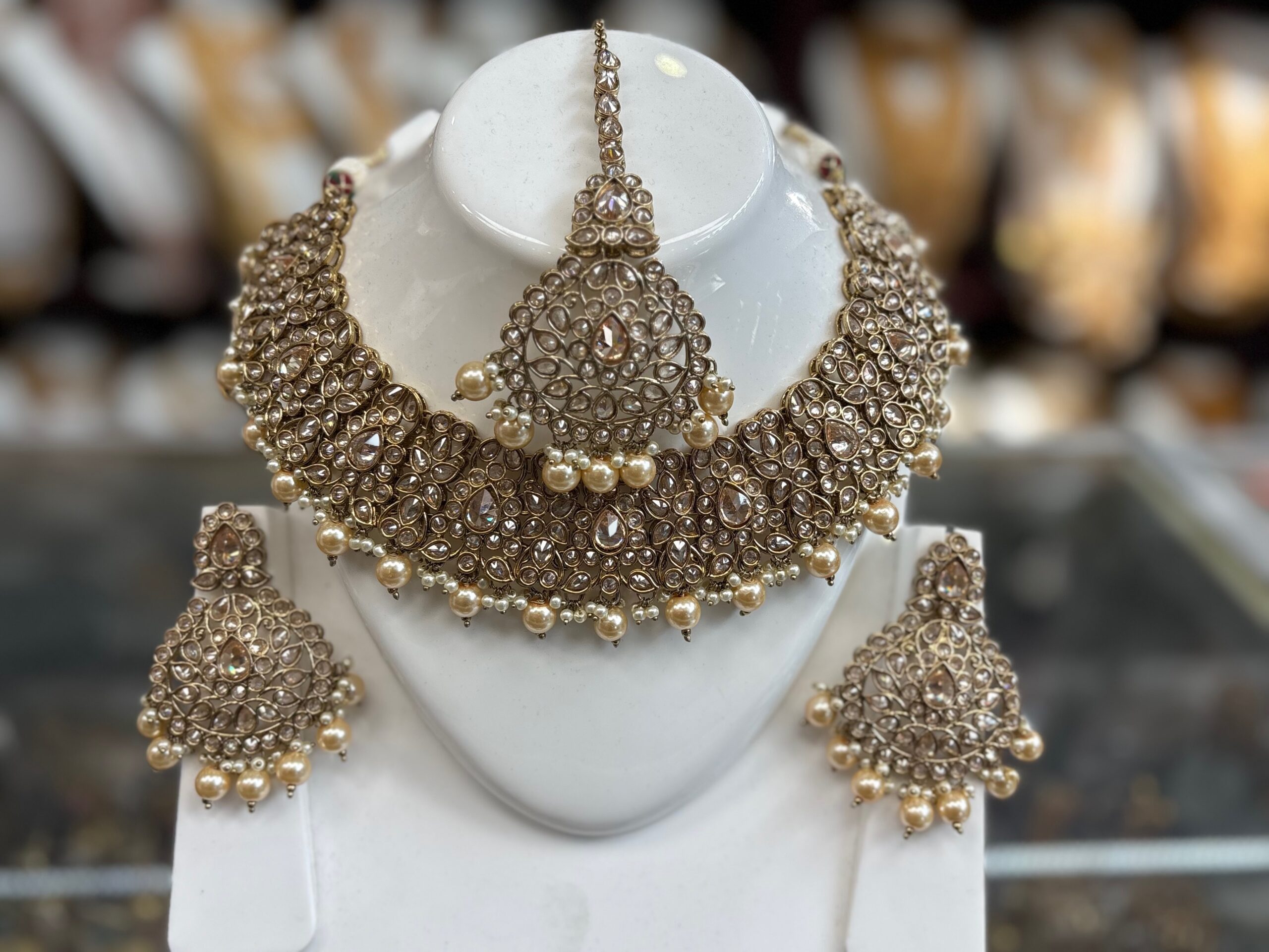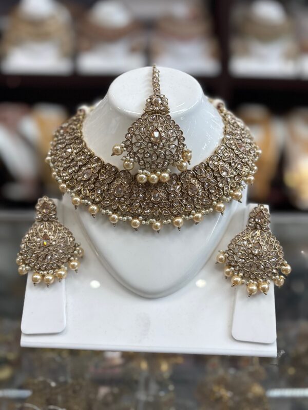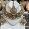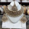 Gold White Kundan Pearl Necklace Choker Earring Maang Tikka White Stone Indian Jewelry Set