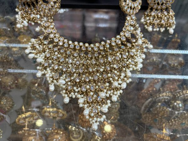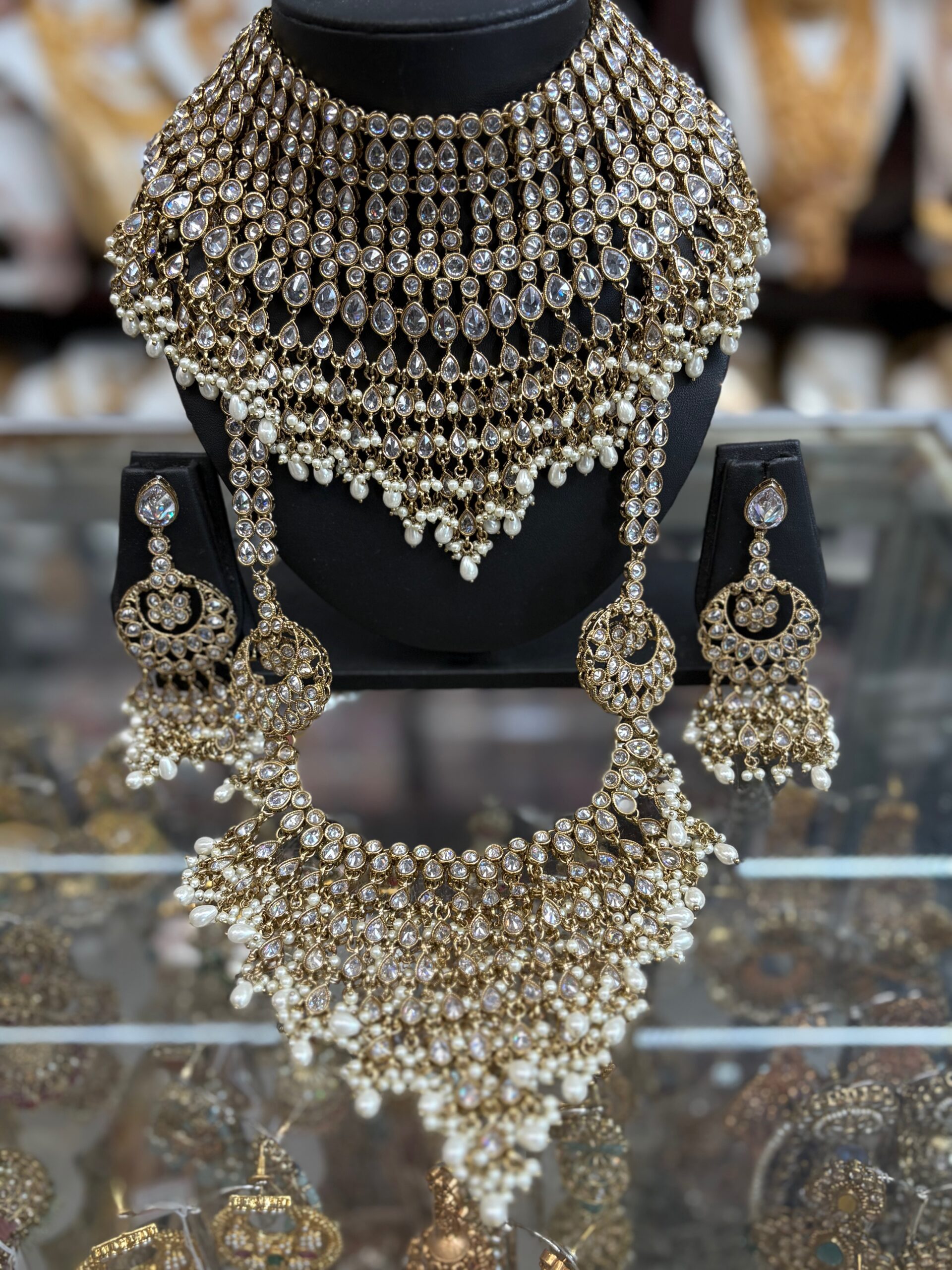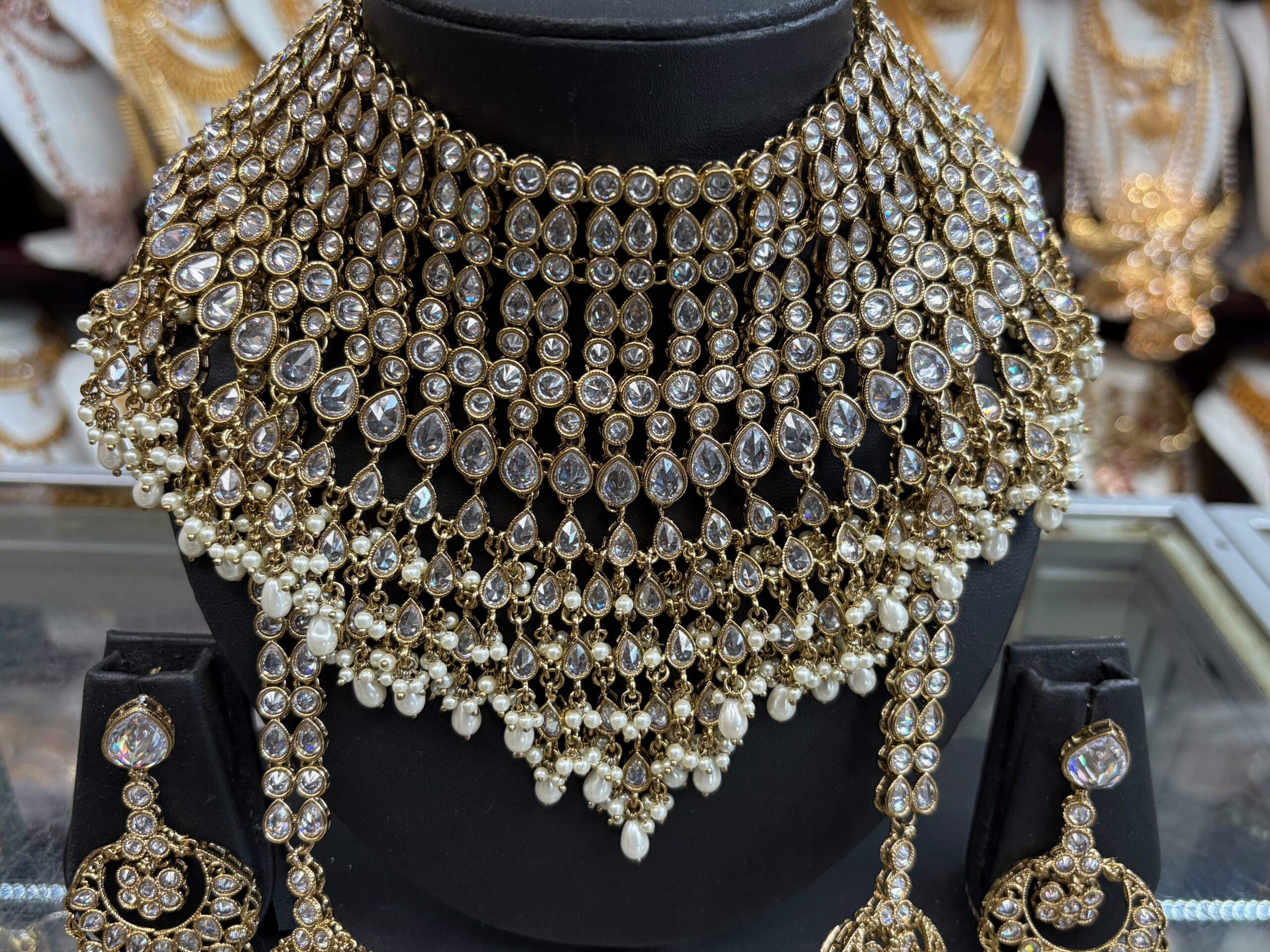 Gold Kundan White Pearl Stones Choker Necklace Earring Tikka Jewelry Set