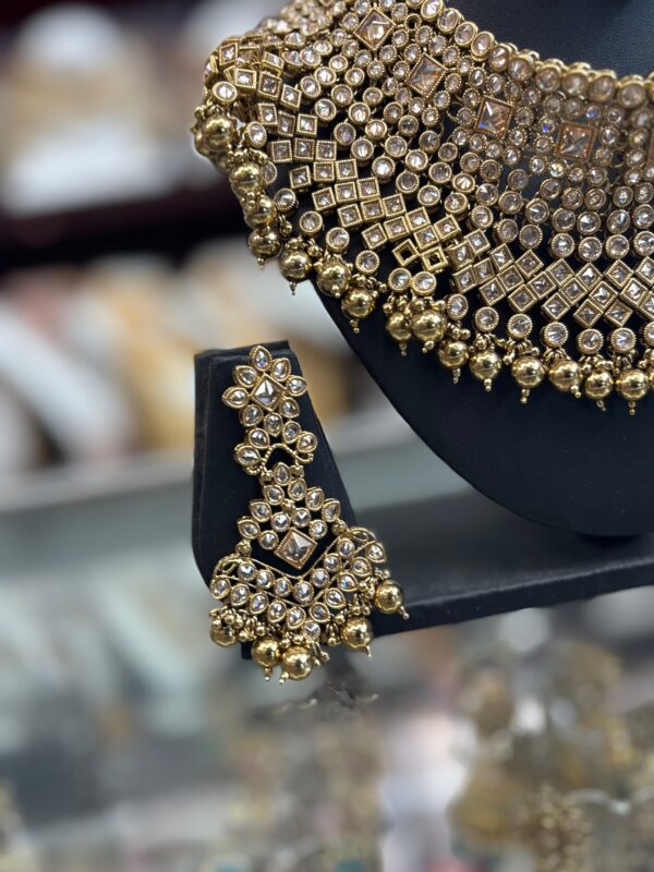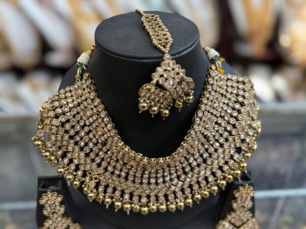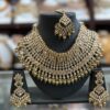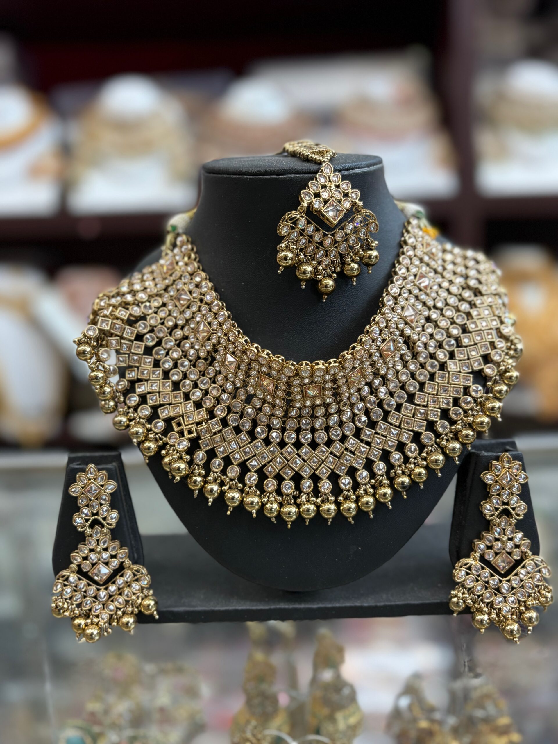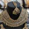 Gold Kundan White Stone Pearl Necklace Choker Earring Maang Tikka Jewelry Set