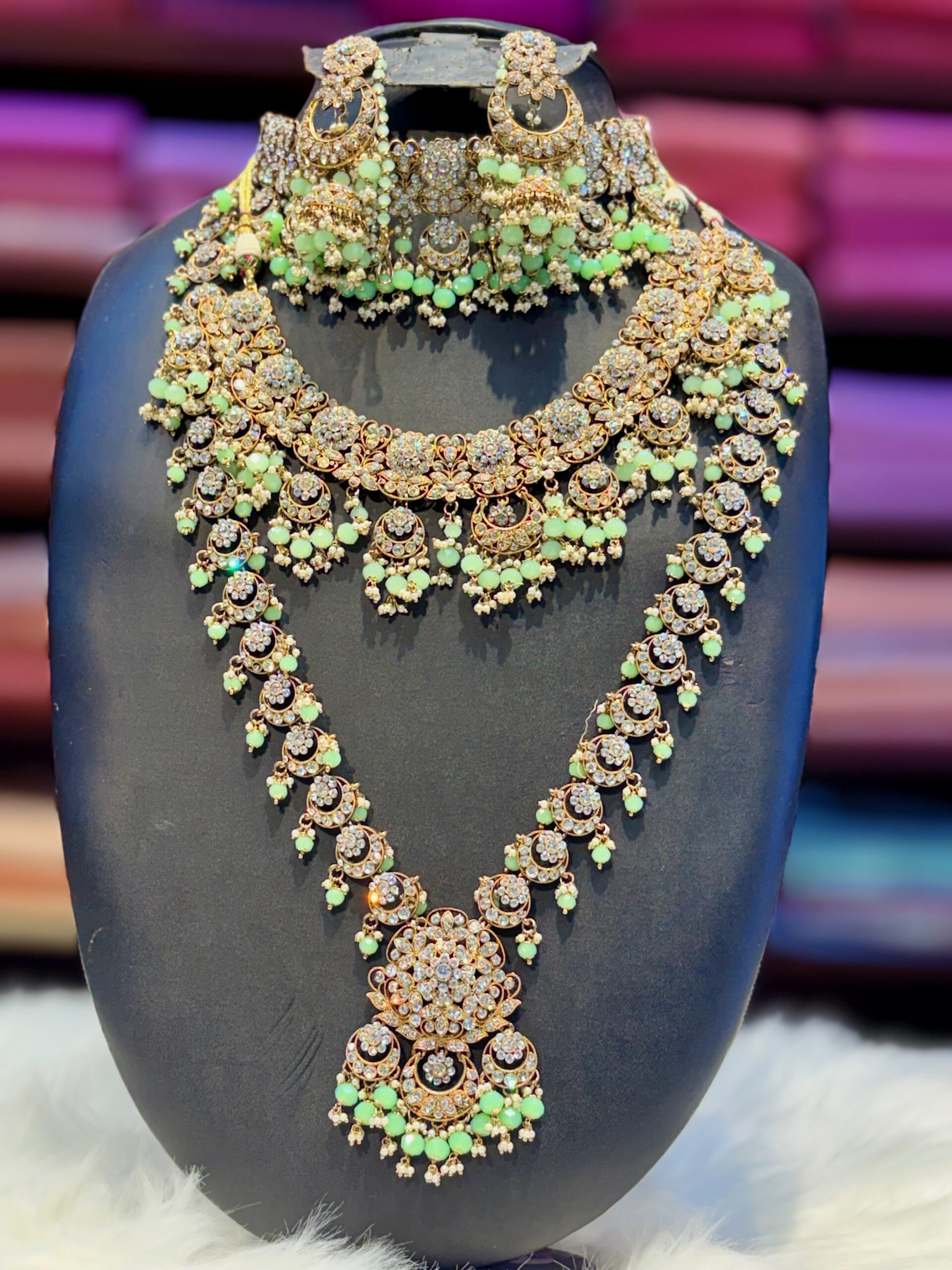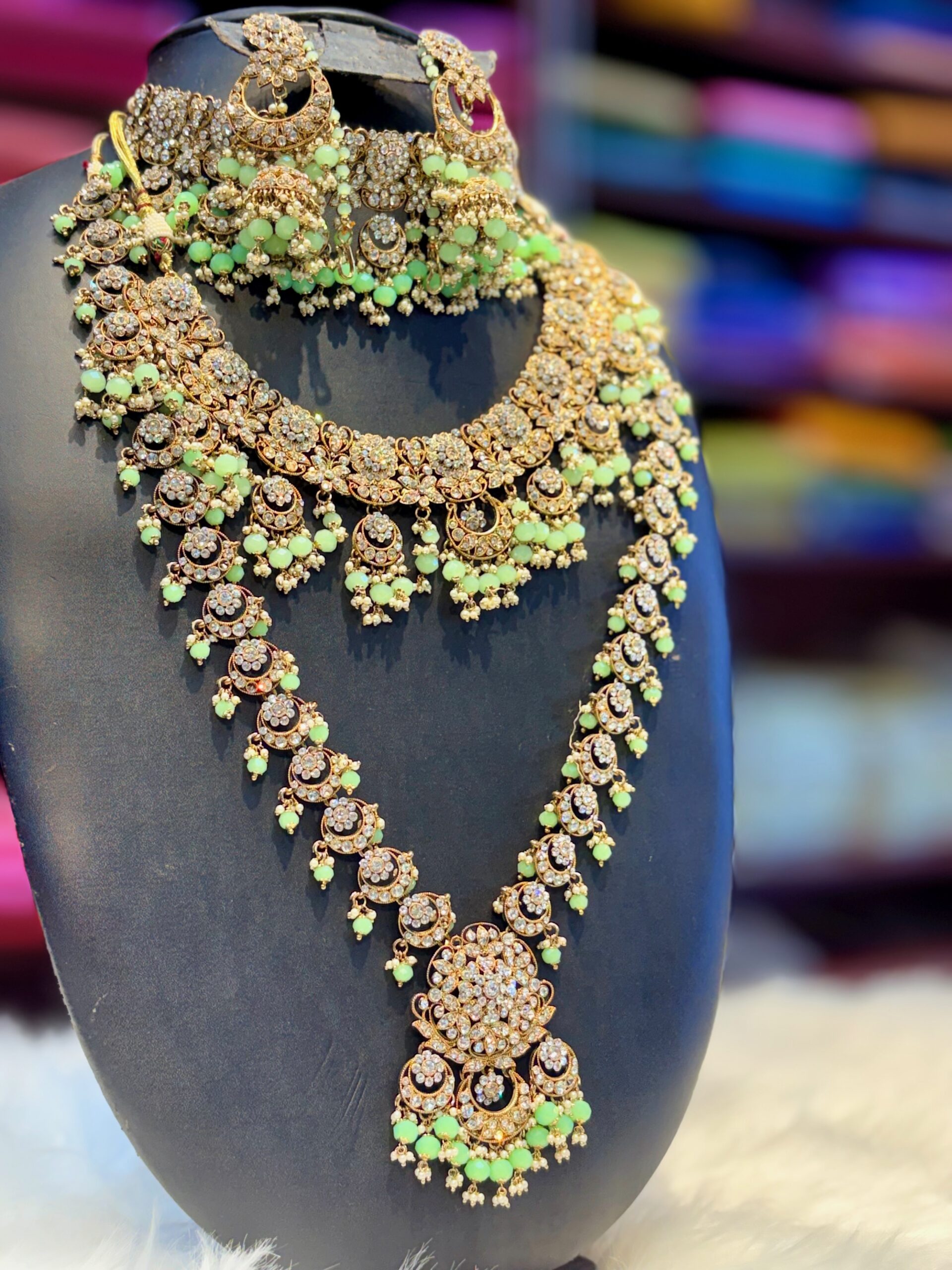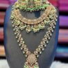 Kundan White Diamond Stones Green Stones Pearls Jewelry Set