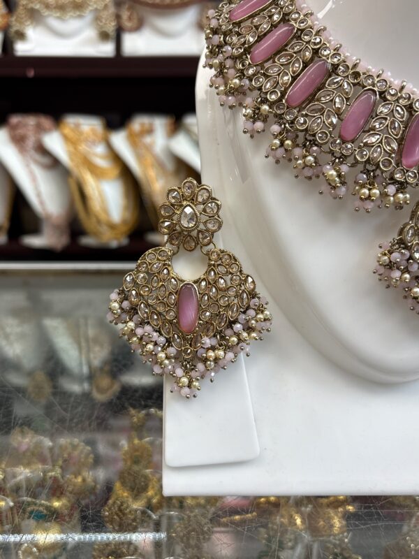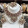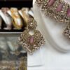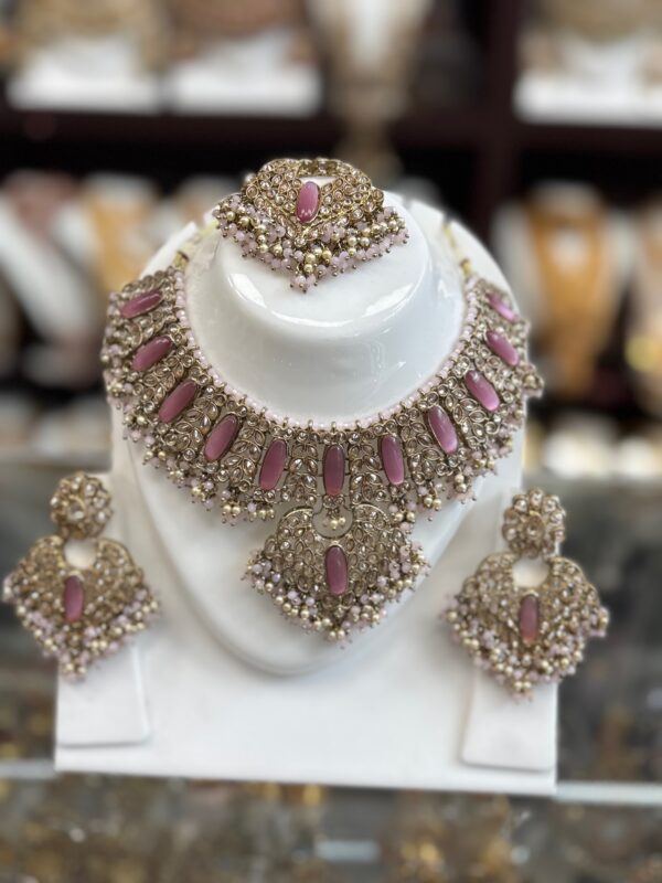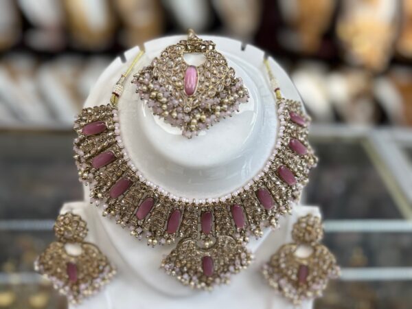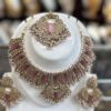 Magenta Pink Gold Choker Necklace Earring Maang Tikka White Stone Magenta Stone Indian Jewelry Set