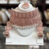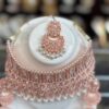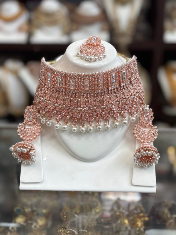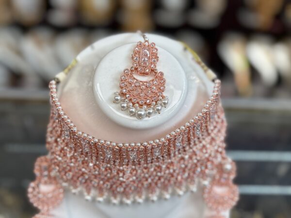 Rose Gold Pink Kundan Choker Necklace Earring Maang Tikka Pearl White Stone Indian Jewelry Set