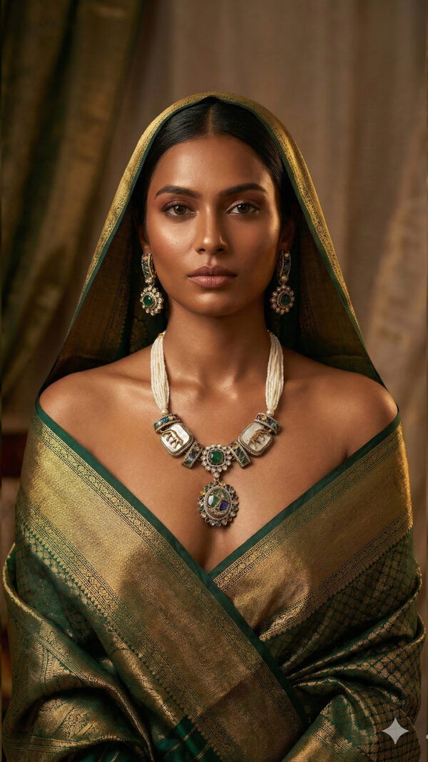 Perfect with Kanjivaram, Banarasi, and heritage silk sarees or rich lehengas for weddings, temple ceremonies, receptions, festive pujas, and photoshoots. Style with a deep neckline and minimal additional jewelry to let this regal set remain the hero of your look.