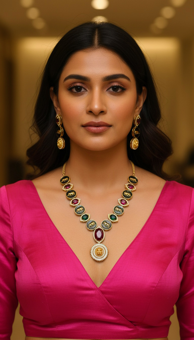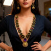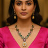 The rich play of greens, pinks, and bold golds is designed to turn heads at every celebration. Whether paired with a silk saree or a chic evening gown, this necklace instantly transforms any outfit into runway royalty—making it the ultimate accessory for weddings, festivities, and unforgettable moments.