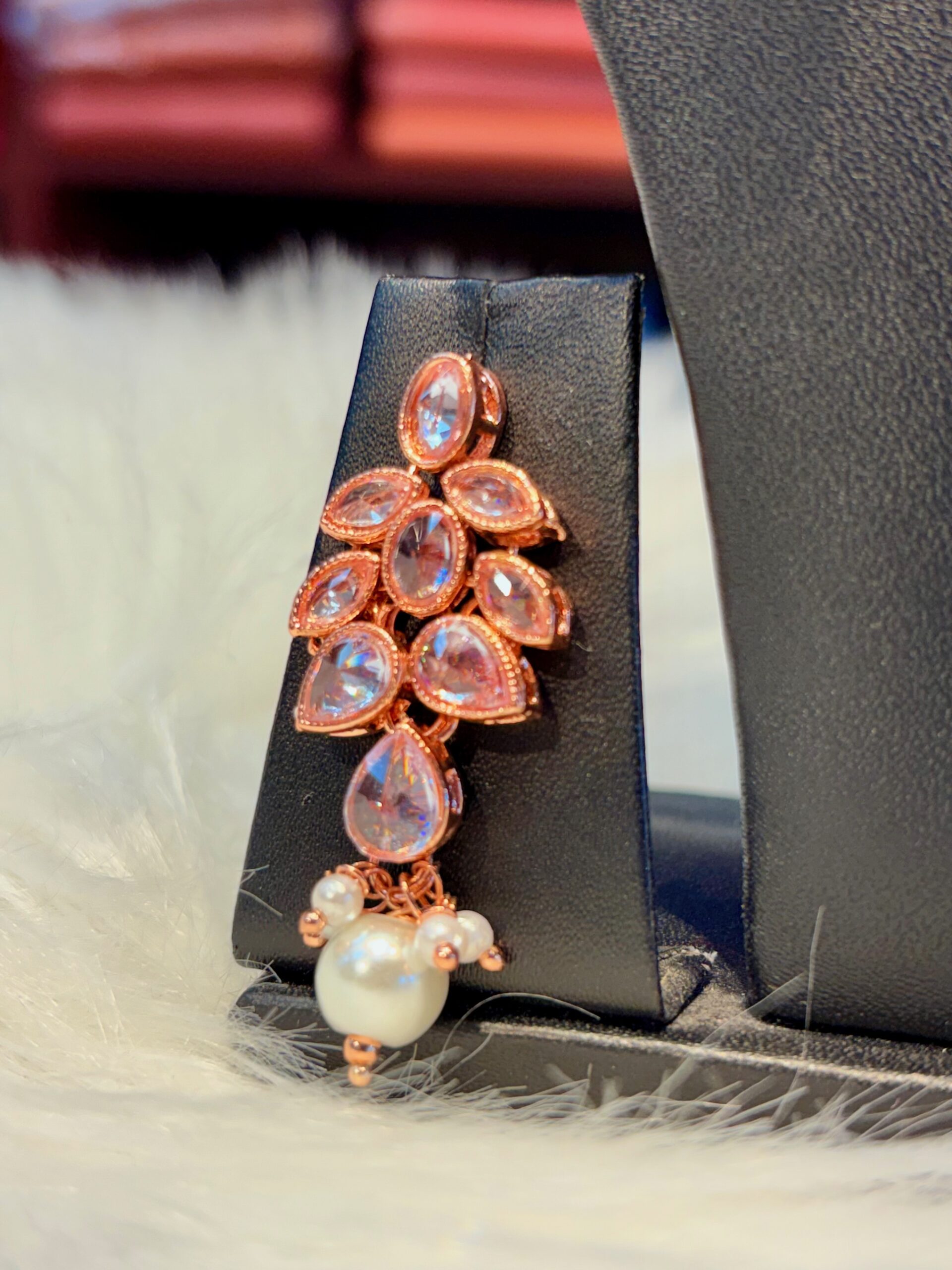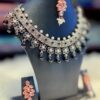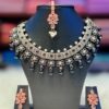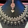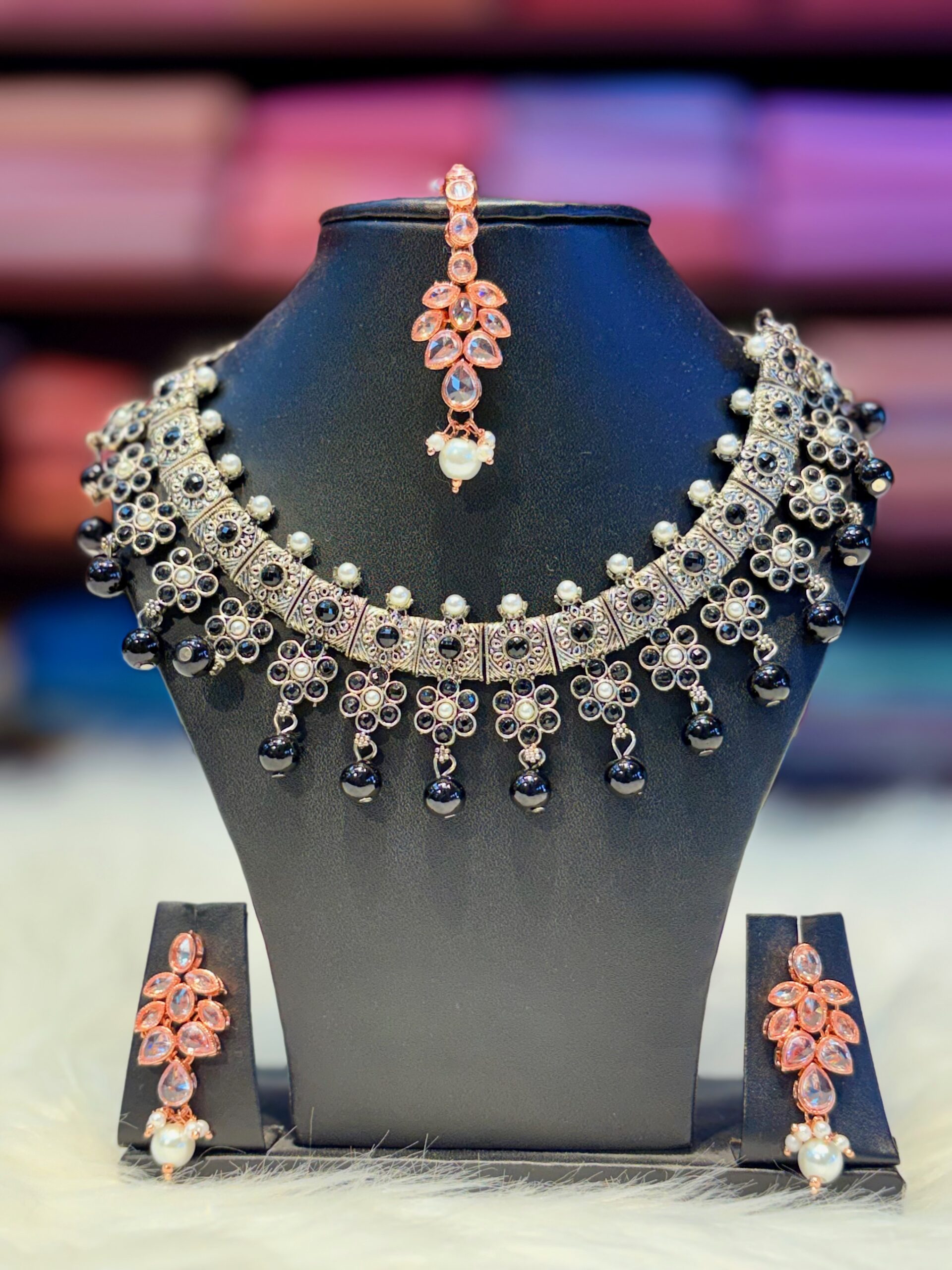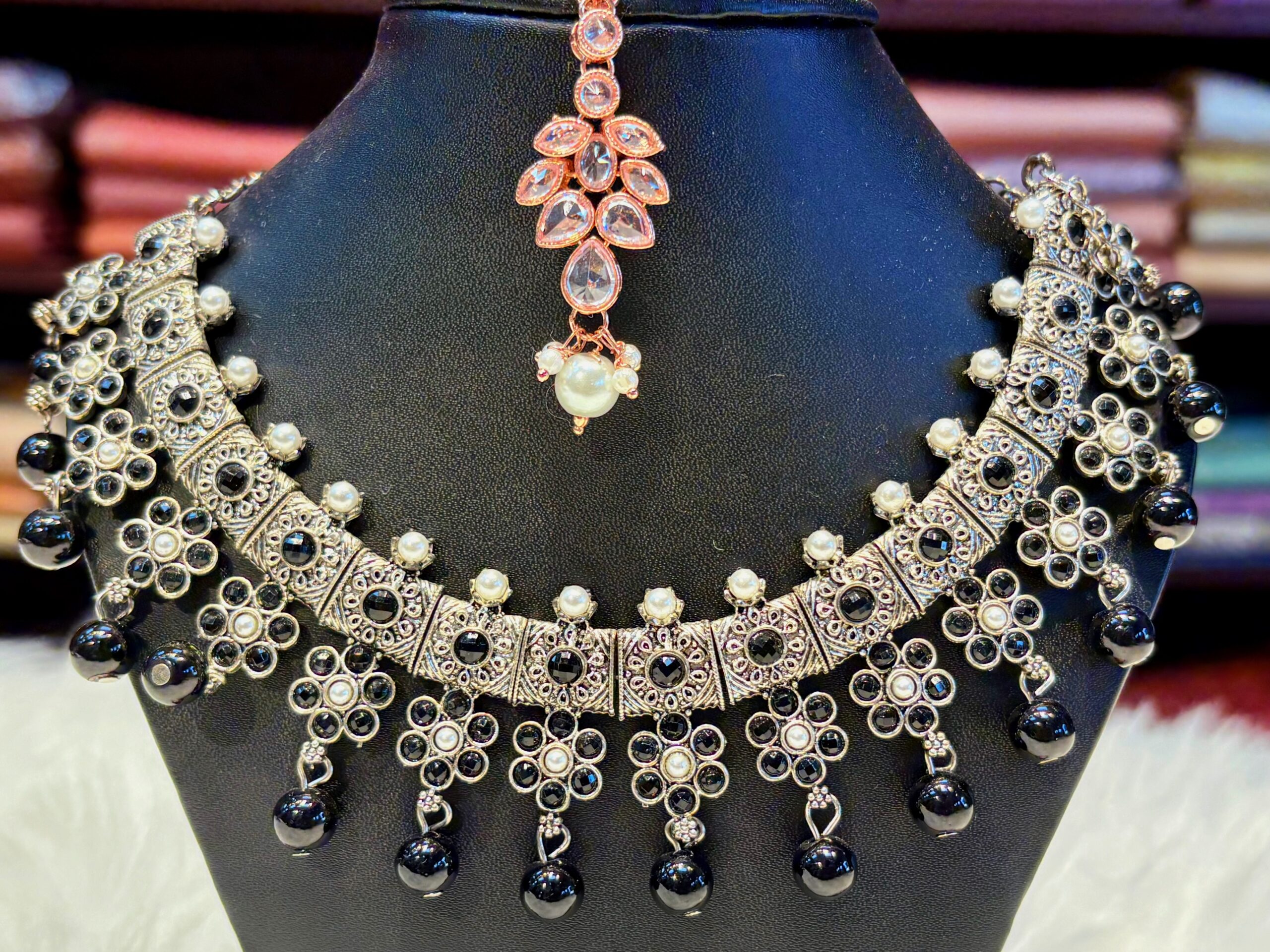 Oxidized Black Stone Pearl Jewelry Set – Necklace Choker Rose Gold White Stones Pearls Earrings/ Jhumkas Maang Tikka Set