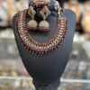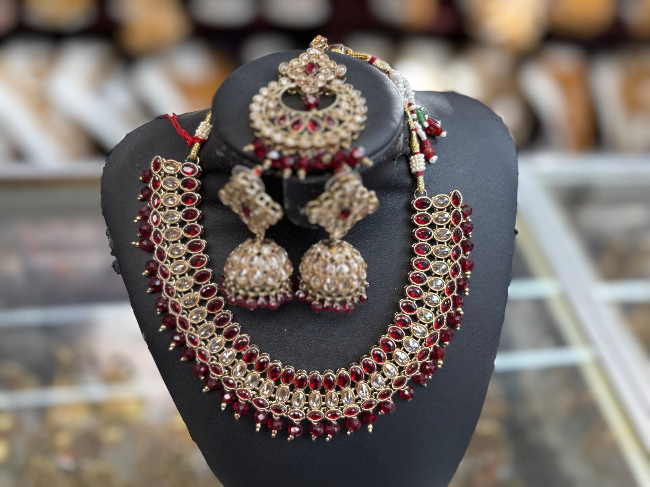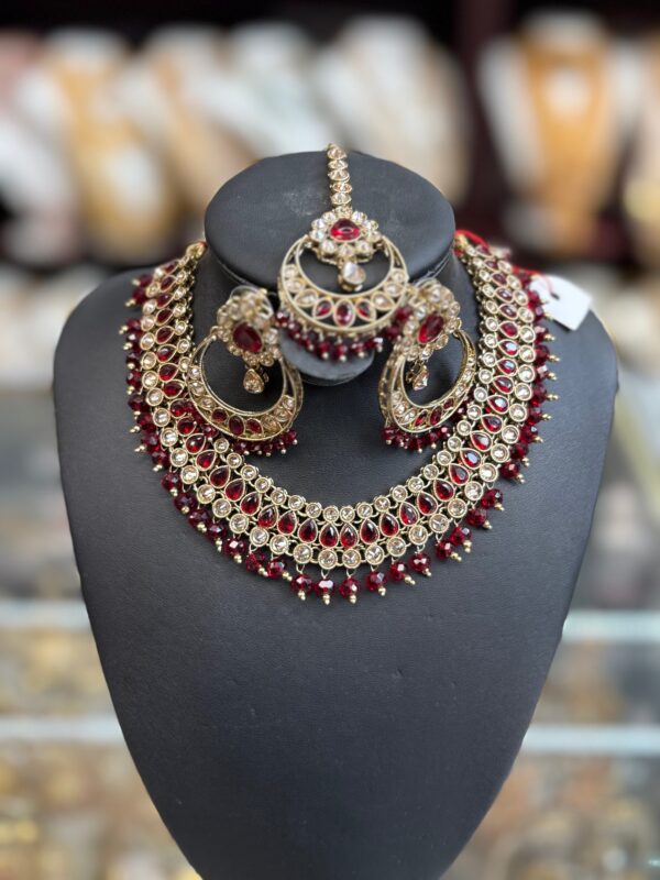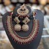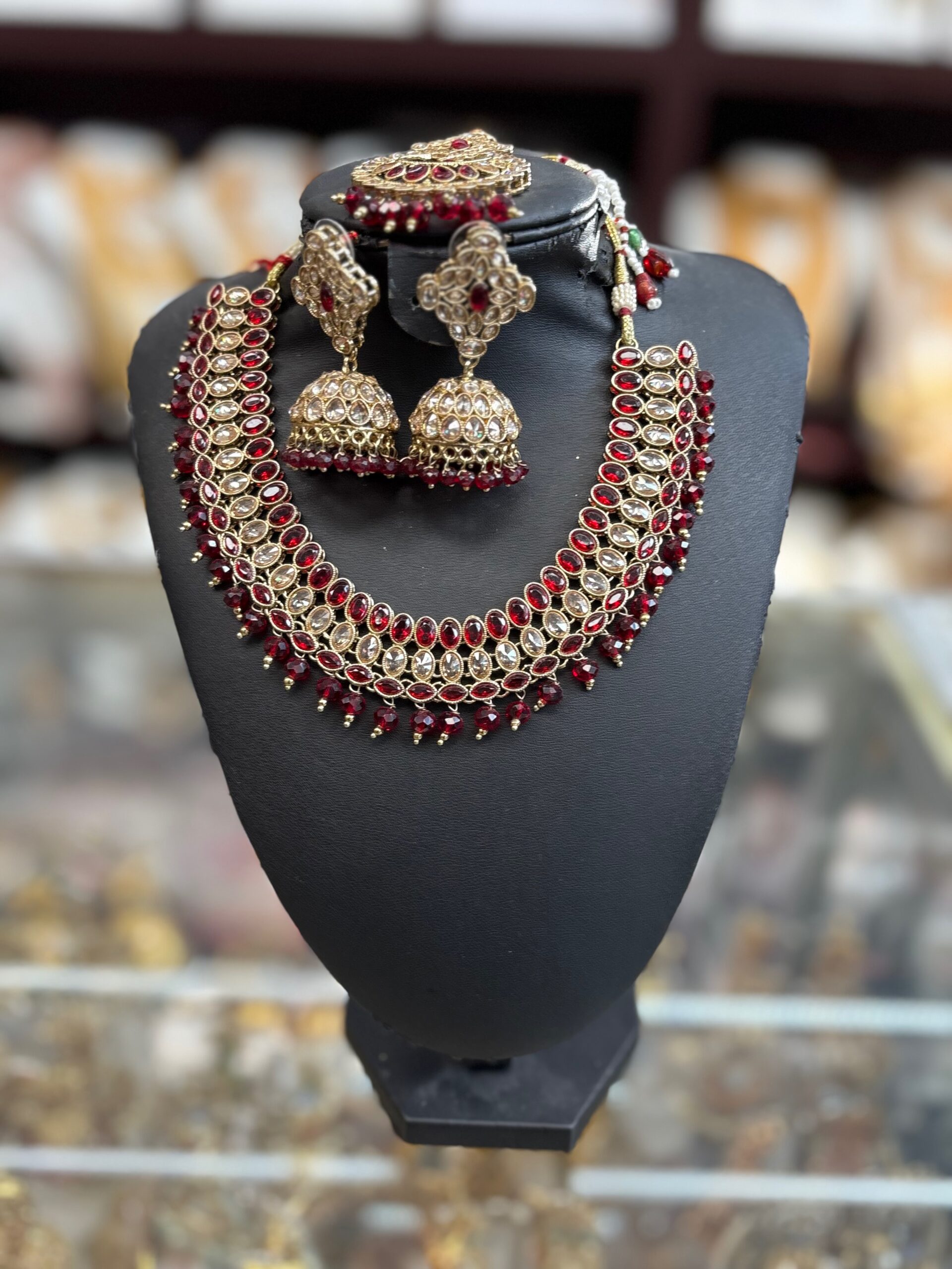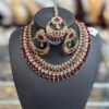 Maroon White Stone Pearl Necklace Choker Earring Maang Tikka Jewelry Set