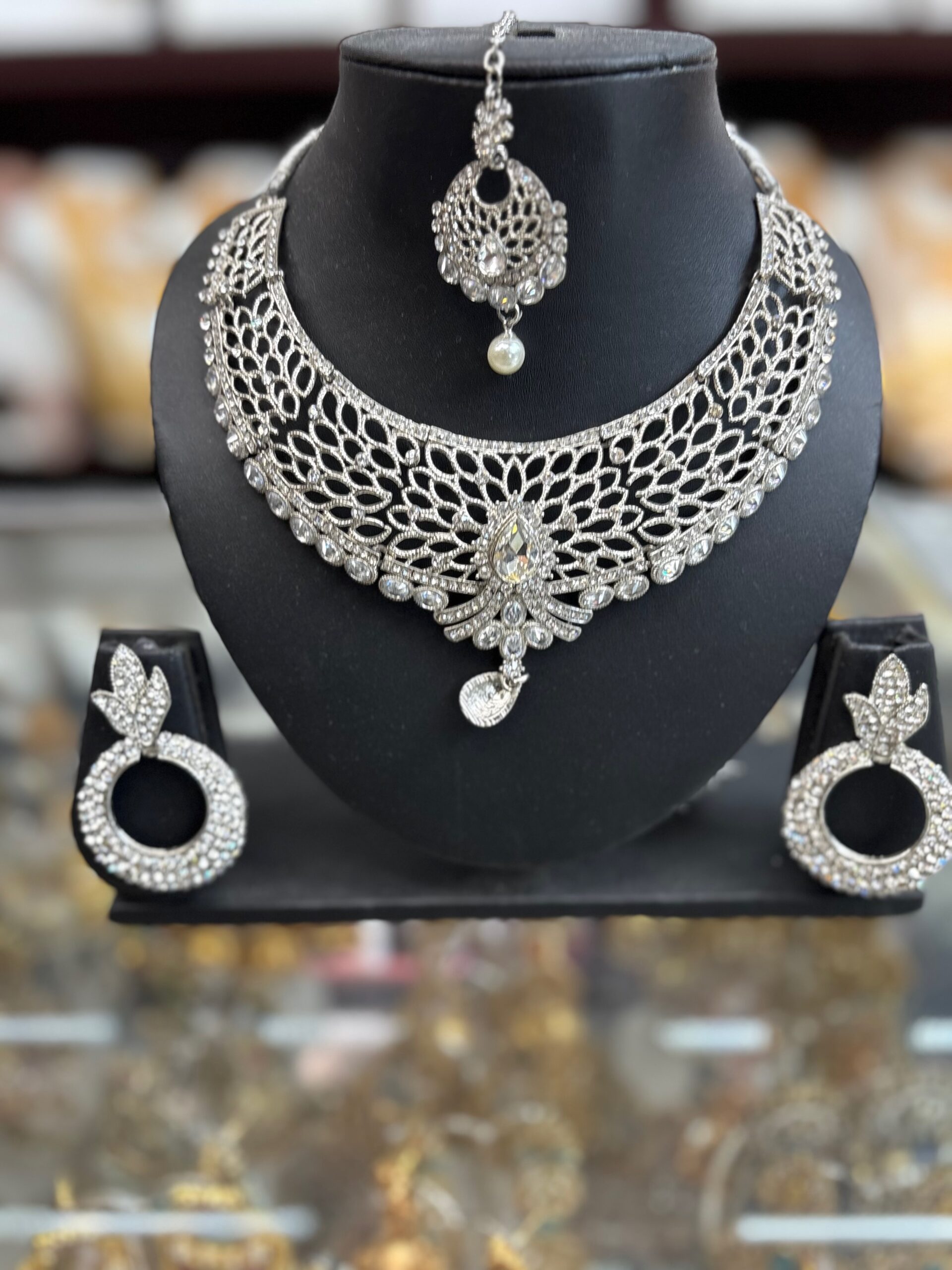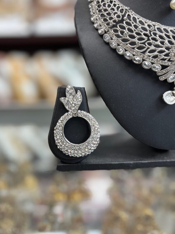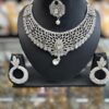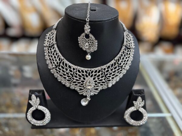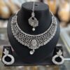 Silver White Stone Diamond Necklace Choker Earring Maang Tikka Jewelry Set