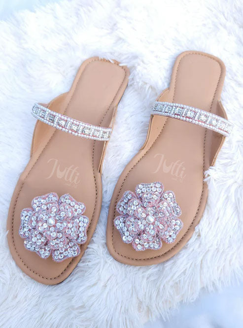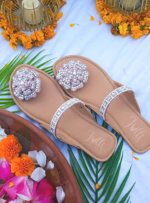 When our “Gulaab” Kolhapuris arrived, our hearts skipped a beat. We haven’t been able to catch the incredible shine on this on video. A dusty pink foundation, statement 3d floral thumb adorned with swarovski gems with a minimalistic crystal and pearl strap. This duo is sure to be a conversation starter.