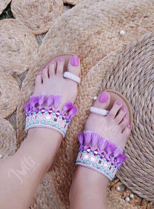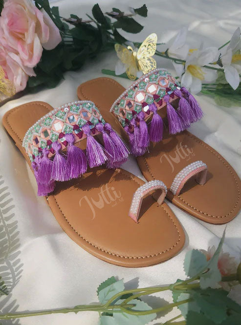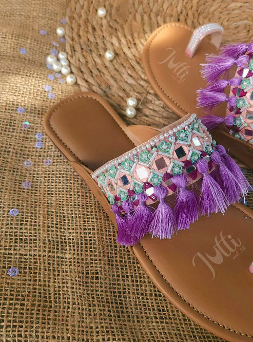 “Iris” is one of our colorful and lively kolhapuris, ideal for everything summer. A stunning pattern that goes well with both Eastern and Western attire is created by mirrors, tea pink thread, mint green sequin flowers, and lavender tassels.