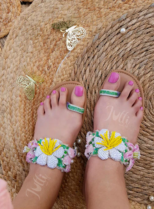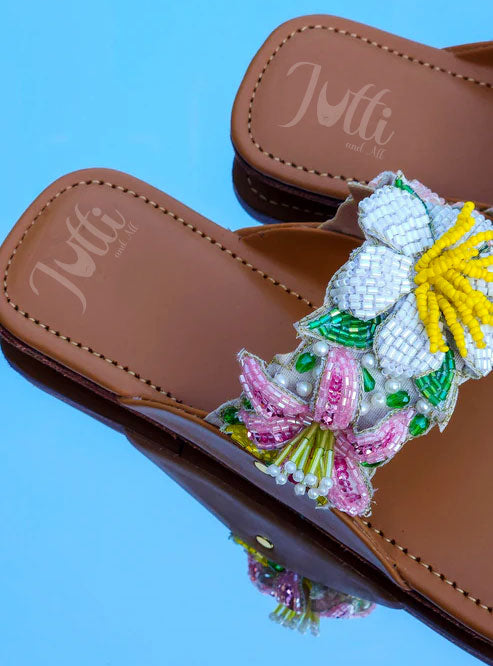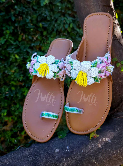 Upon the completion of this design, our hearts skipped a beat. Our “Periwinkle” kolhapuris would be the perfect summertime shoe if they were a pair. A 3D flower design that was created by hand with hundreds of kat dana, beads, pearls, sequins, and crystals.