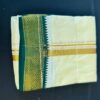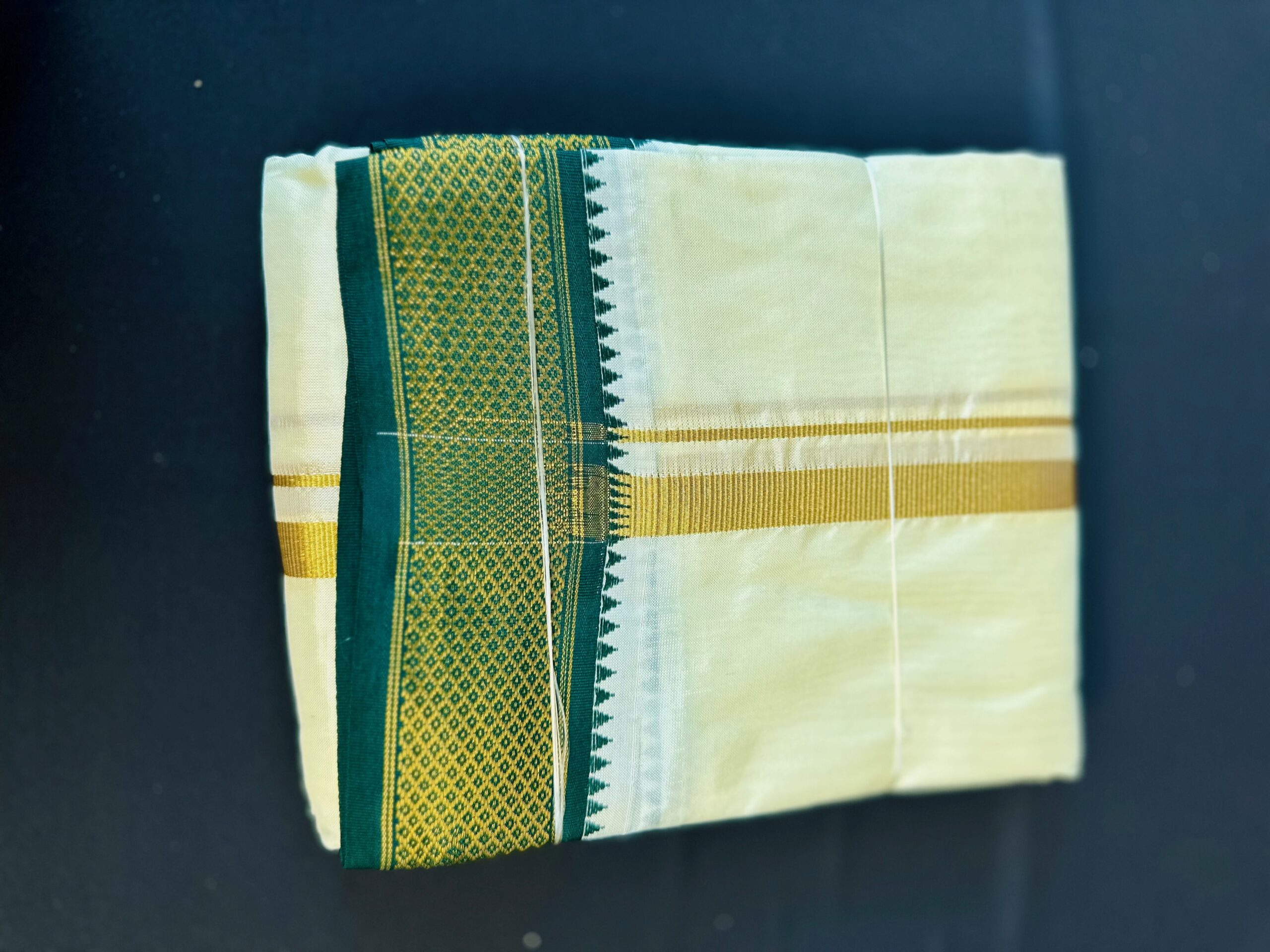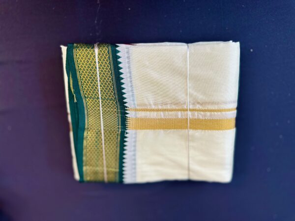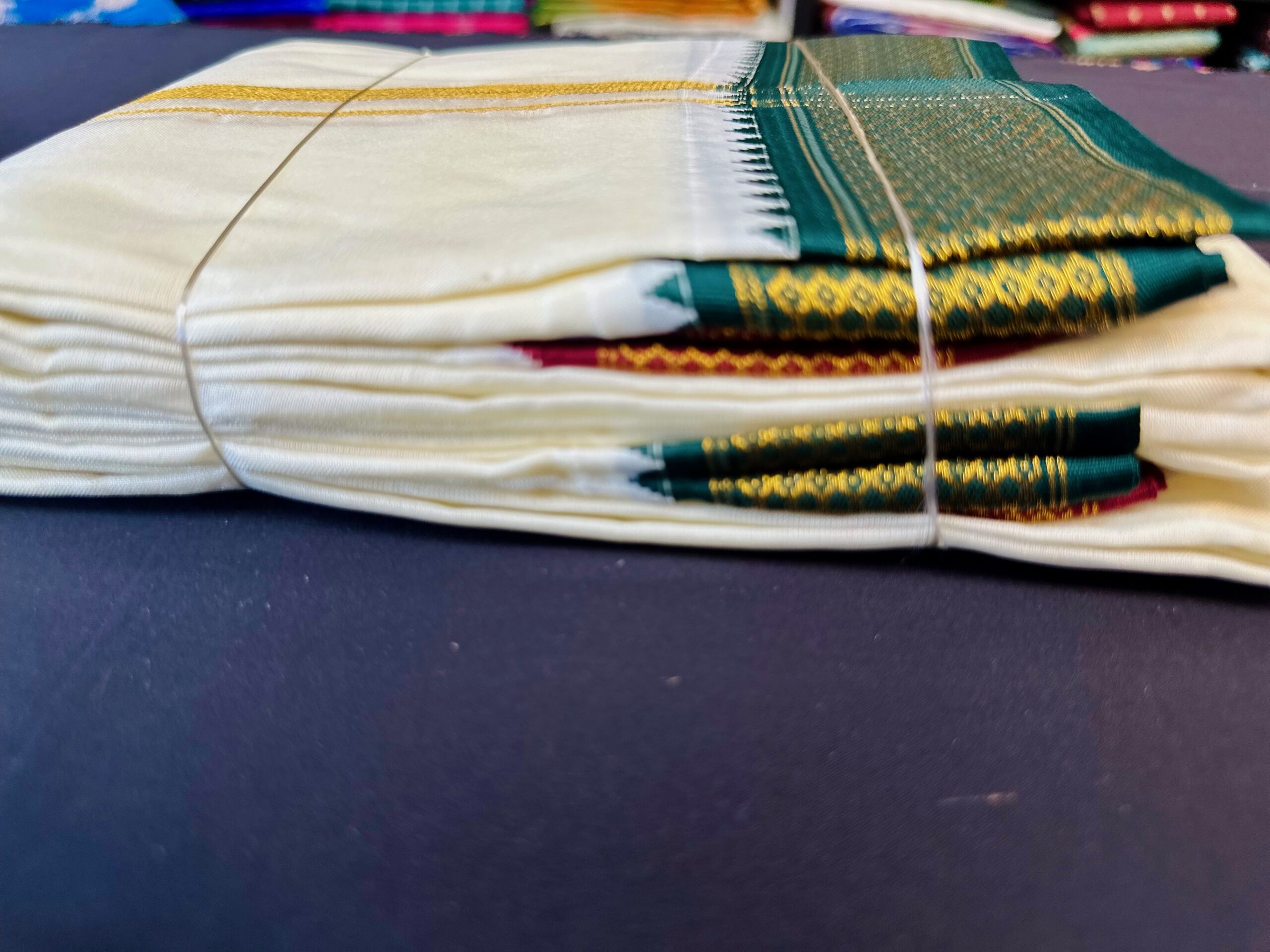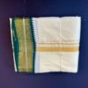 White Silk Dhoti with Green Gold border for weddings, pujas and other ceremonies and festivals