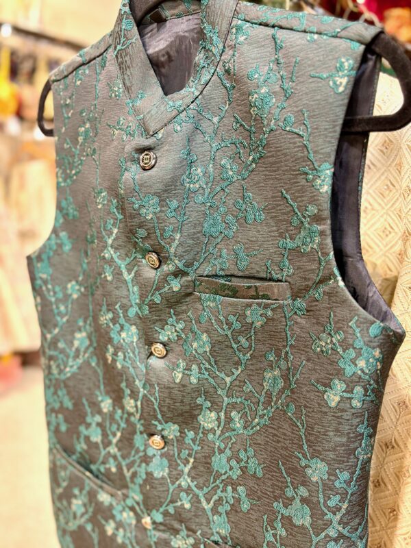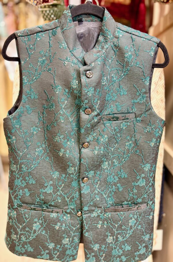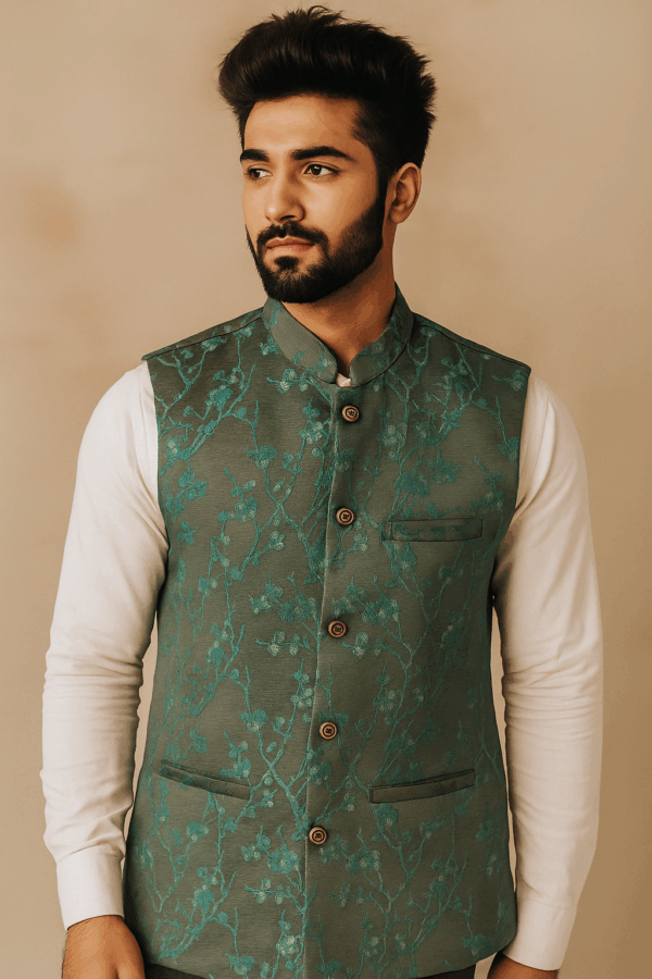 Stylish dark green designer silk waistcoat jacket with elegant floral embroidery detailing.