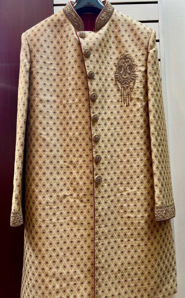 Beige Color Silk Wedding Sherwani Gold Embroidery for men gold chain brooch