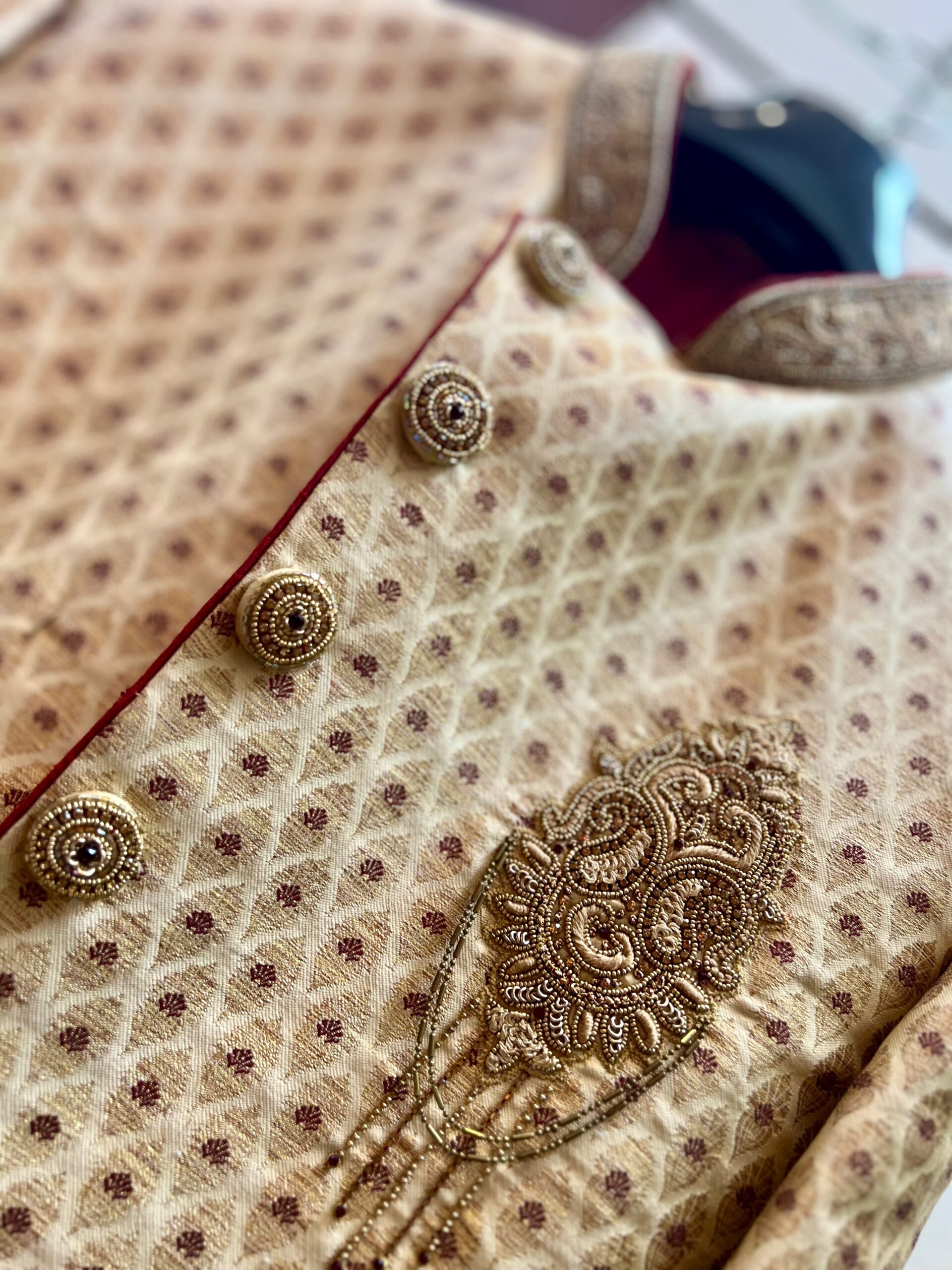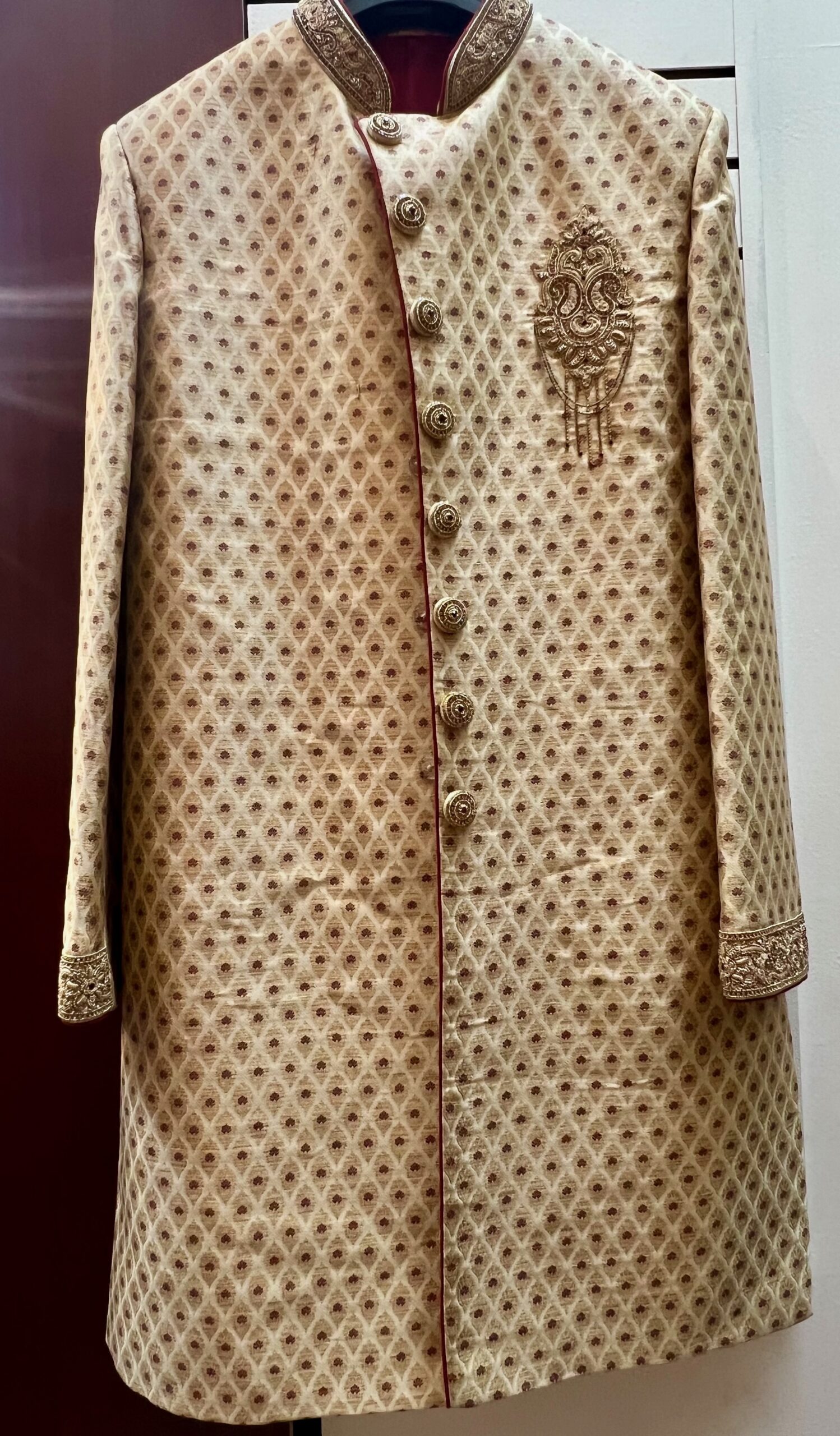 Beige Wedding Sherwani Embroidered Kurta for men with Gold chain Brooch