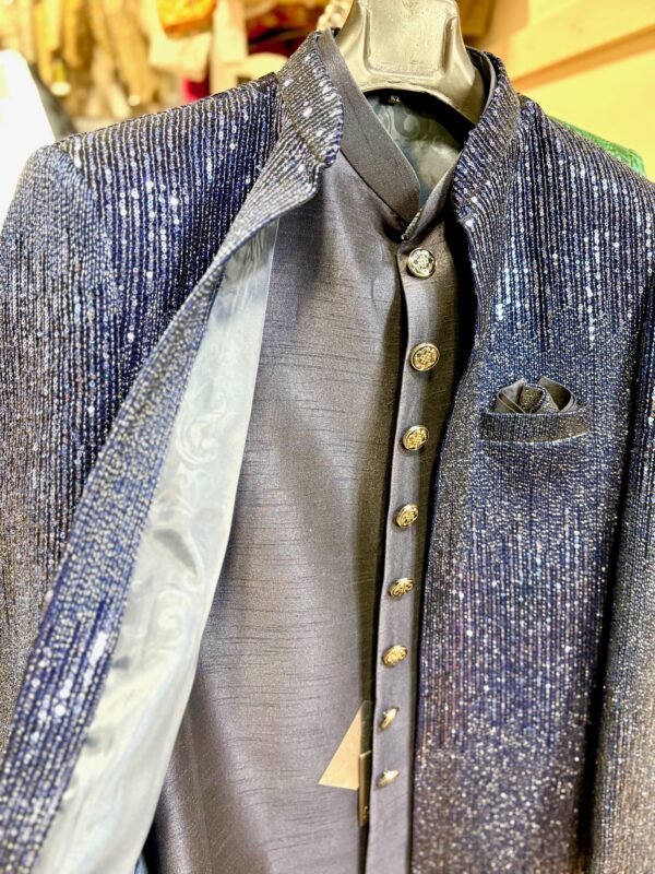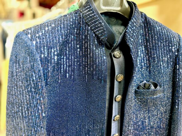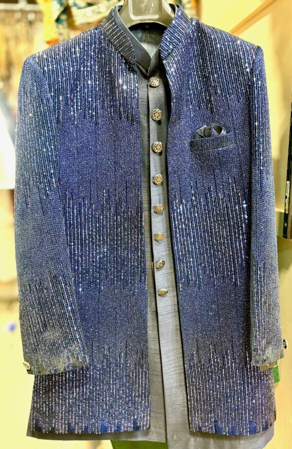 This is a luxurious midnight blue sherwani adorned with sequined vertical embroidery, creating a shimmering, gradient effect from top to bottom.
