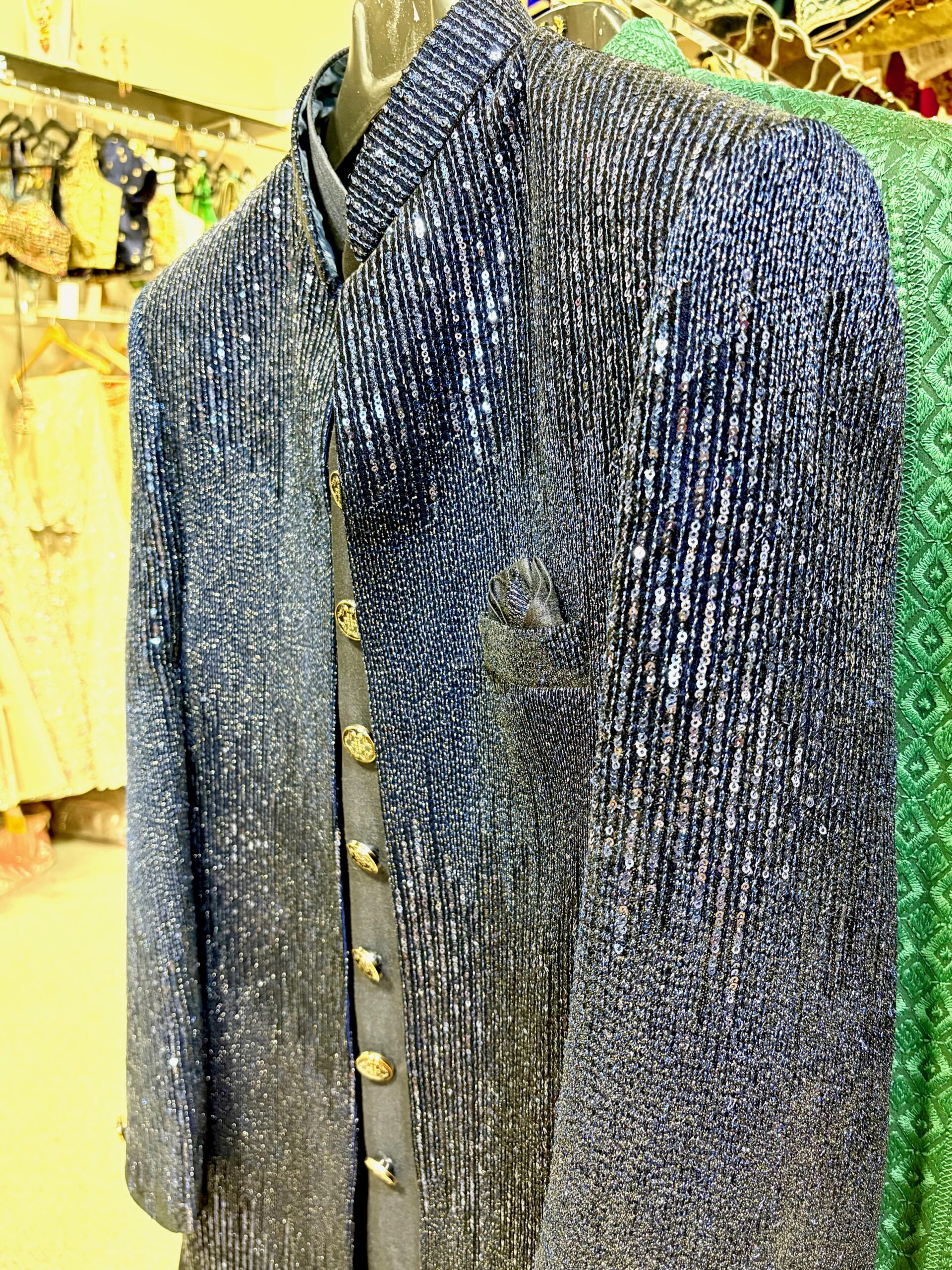 This is a luxurious midnight blue sherwani adorned with sequined vertical embroidery, creating a shimmering, gradient effect from top to bottom.