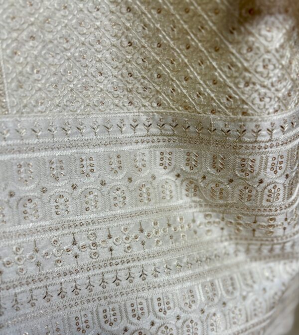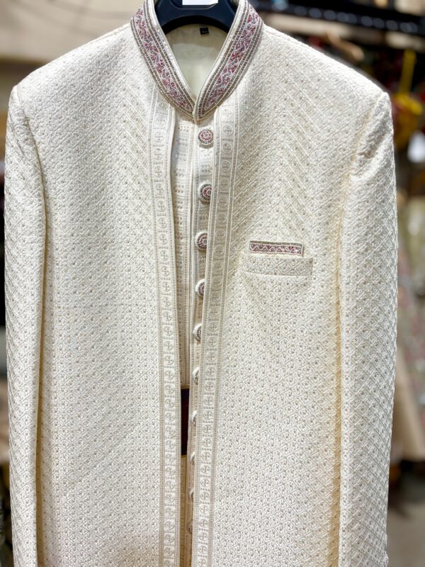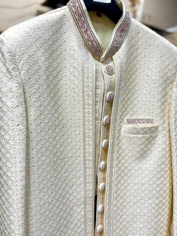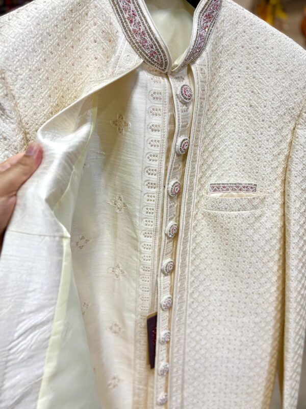 Elegant Off-White Sherwani: Crafted with intricate thread embroidery in a regal geometric pattern for a luxurious and traditional look.