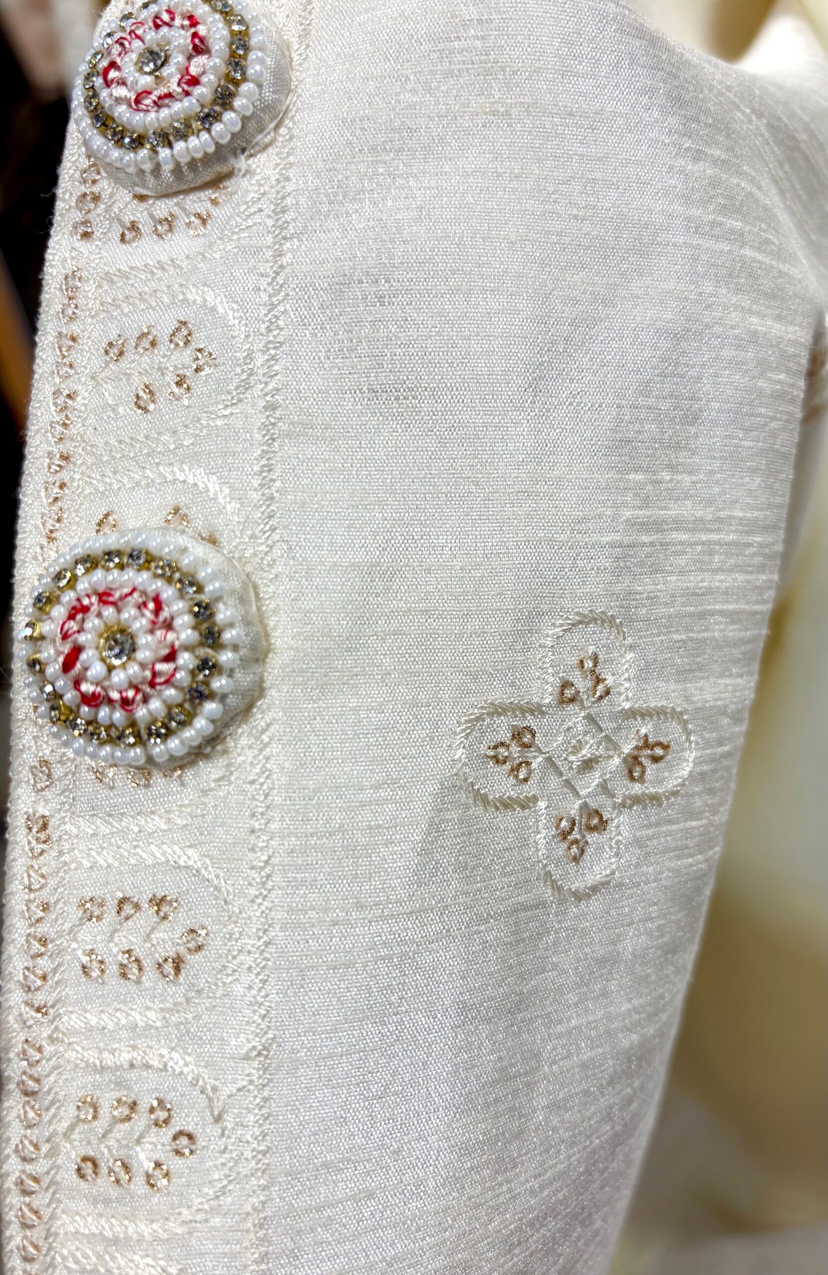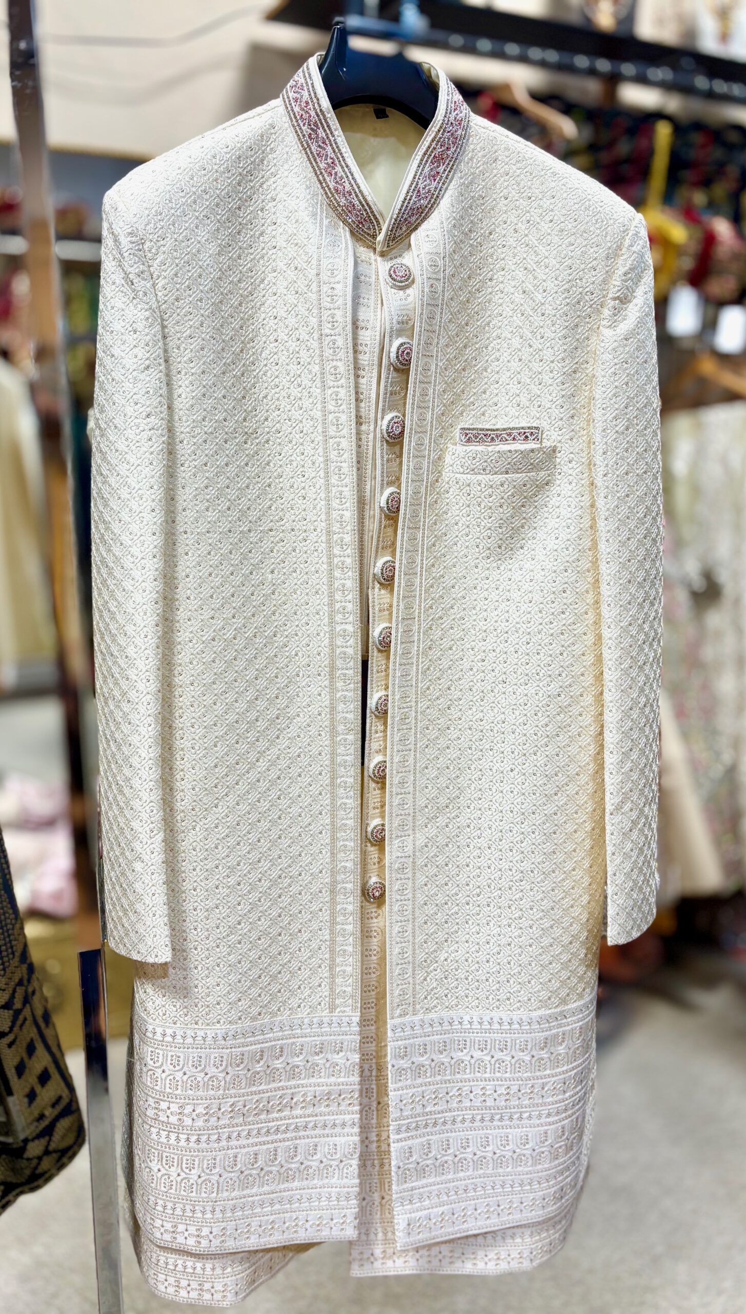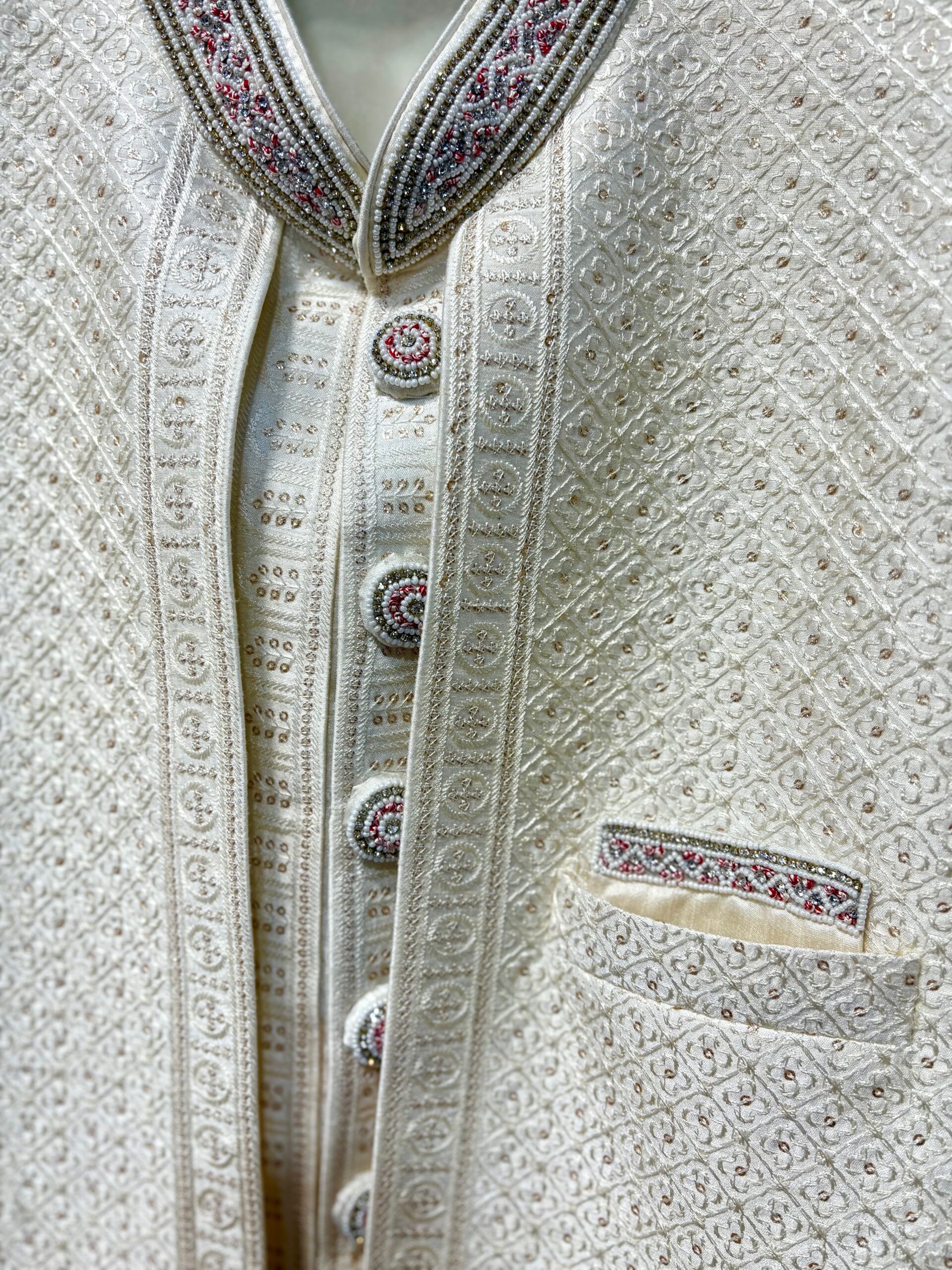 Elegant Off-White Sherwani: Crafted with intricate thread embroidery in a regal geometric pattern for a luxurious and traditional look.