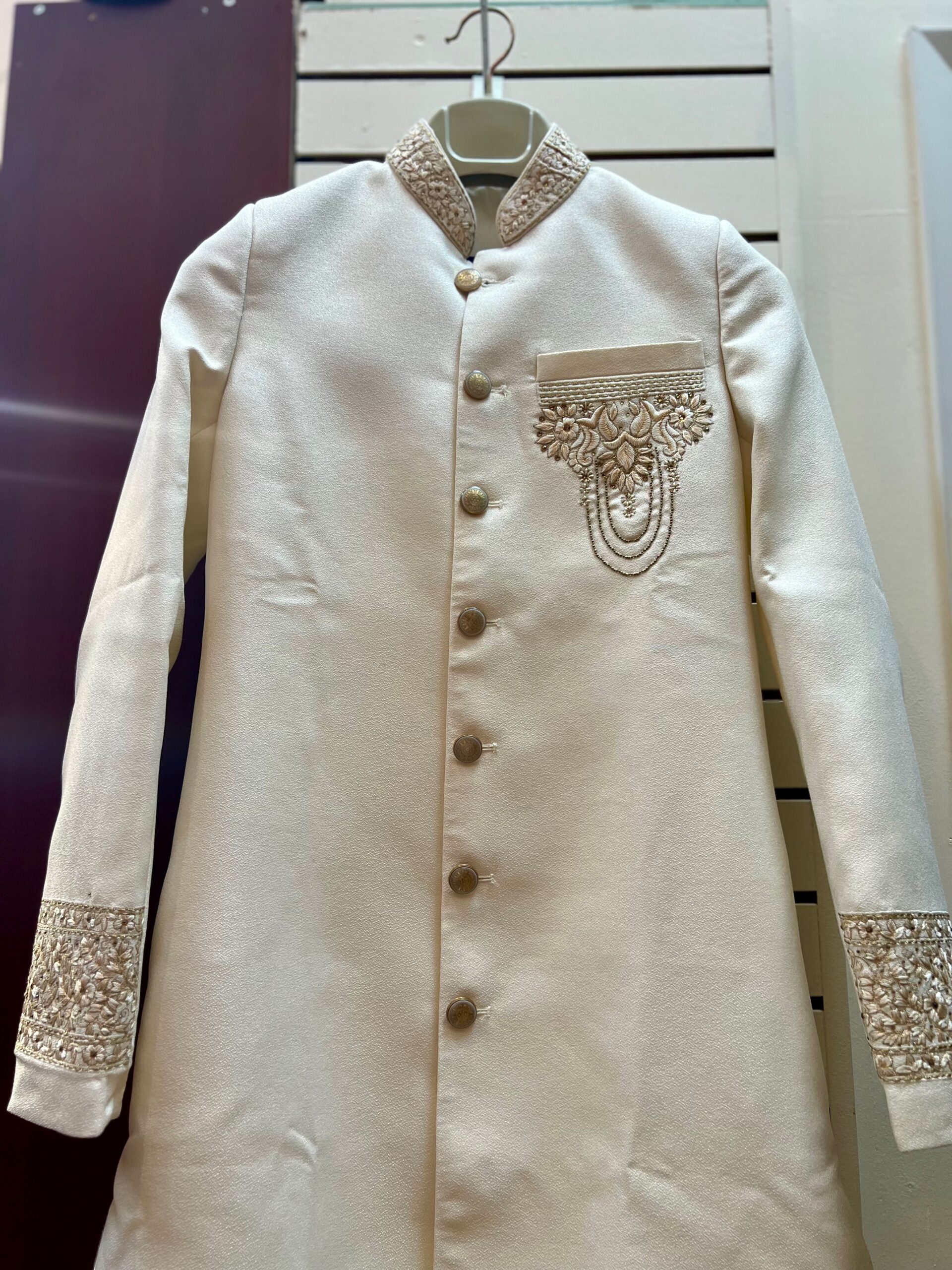 Beige Color Silk Wedding Sherwani Gold Embroidery for men